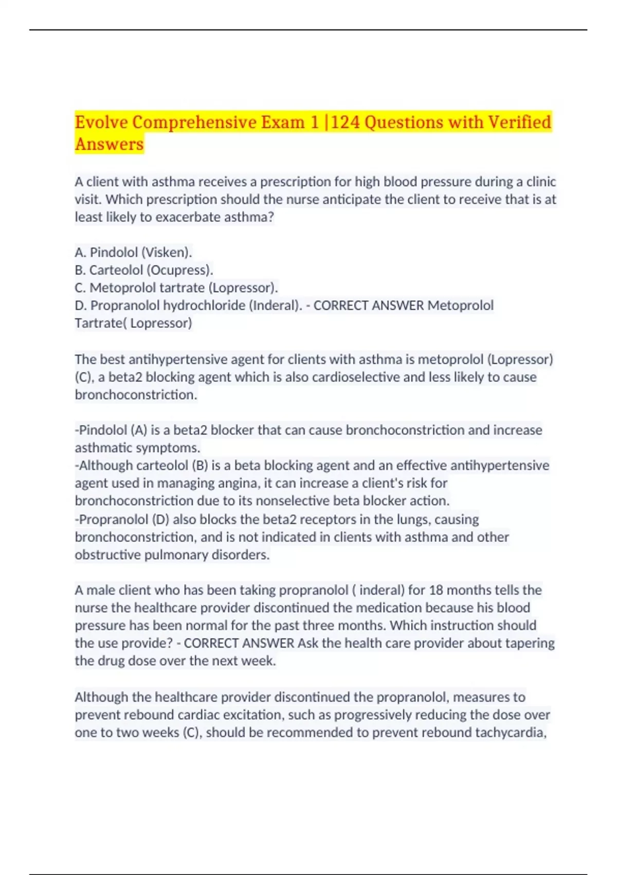 Evolve Comprehensive Exam 1 |124 Questions with Verified Answers A client with asthma receives a prescription for high blood pressure during a clinic visit. Which prescription should the nurse anticipate the client to receive that is at least likely to exacerbate asthma? A. Pindolol (Visken). B. Carteolol (Ocupress). C. Metoprolol tartrate (Lopressor). D. Propranolol hydrochloride (Inderal). - CORRECT ANSWER Metoprolol Tartrate( Lopressor) The best antihypertensive agent for clients with asthma is metoprolol (Lopressor) (C), a beta2 blocking agent which is also cardioselective and less likely to cause bronchoconstriction. -Pindolol (A) is a beta2 blocker that can cause bronchoconstriction and increase asthmatic symptoms. -Although carteolol (B) is a beta blocking agent and an effective antihypertensive agent used in managing angina, it can increase a client's risk for bronchoconstriction due to its nonselective beta blocker action. -Propranolol (D) also blocks the beta2 receptors in the lungs, causing bronchoconstriction, and is not indicated in clients with asthma and other obstructive pulmonary disorders. A male client who has been taking propranolol ( inderal) for 18 months tells the nurse the healthcare provider discontinued the medication because his blood pressure has been normal for the past three months. Which instruction should the use provide? - CORRECT ANSWER Ask the health care provider about tapering the drug dose over the next week. Although the healthcare provider discontinued the propranolol, measures to prevent rebound cardiac excitation, such as progressively reducing the dose over one to two weeks (C), should be recommended to prevent rebound tachycardia, hypertension, and ventricular dysrhythmias. Abrupt cessation (A and B) of the beta-blocking agent may precipitate tachycardia and rebound hypertension, so gradual weaning should be recommended. A client who is taking clonidine ( Catapres, Duraclon) reports drowsiness. Which additional assessment should the nurse make? - CORRECT ANSWER How long has the client been taking the medication Drowsiness can occur in the early weeks of treatment with clonidine and with continued use becomes less intense, so the length of time the client has been on the medication (A) provides information to direct additional instruction. (B, C, and D) are not relevant. The nurse is preparing to admister atropine, an anticholinergic, to a client who is scheduled for a cholecystectomy. The client asks the nurse to explain th reason for the prescribed medication. What response is best for the nurse to provide? - CORRECT ANSWER Decrease the risk of bradycardia during surgery Atropine may be prescribed preoperatively to increase the automaticity of the sinoatrial node and prevent a dangerous reduction in heart rate (B) during surgical anesthesia. (A, C and D) do not address the therapeutic action of atropine use perioperatively. An 80 year old client is given morphine sulphate for postoperative pain. Which concomitant medication should the nurse question that poses a potential development of urniary retention in this geriatric client. ? - CORRECT ANSWER Tricyclic antidepressants Drugs with anticholinergic properties, such as tricyclic antidepressants (C), can exacerbate urinary retention associated with opioids in the older client. Although tricyclic antidepressants and antihistamines with opioids can exacerbate urinary retention, the concurrent use of (A and B) with opioids do not. Nonsteroidal antiinflammatory agents (D) can increase the risk for bleeding, but do not increase urinary retention with opioids (D). The nurse obtains a heart rate of 92 and a blood pressure of 110/76 prior to administering a scheduled dose of verapamil (Calan) for a client with atrial flutter Which action should the nurse implement? - CORRECT ANSWER Admister the dose as prescribed Verapamil slows sinoatrial (SA) nodal automaticity, delays atrioventricular (AV) nodal conduction, which slows the ventricular rate, and is used to treat atrial flutter, so (A) should be implemented, based on the client's heart rate and blood pressure. (B and C) are not indicated. (D) delays the administration of the scheduled dose. following an emergency Cesarean delivery the nurse encourages the new mother to breastfed her newborn . the client asks why she should breastfeed now. Which info should the nurse provide? - CORRECT ANSWER Stimulate contraction of the uterus When the infant suckles at the breast, oxytocin is released by the posterior pituitary to stimulates the "letdown" reflex, which causes the release of colostrum, and contracts the uterus (C) to prevent uterine hemorrhage. (A and B) do not support the client's need in the immediate period after the emergency delivery. Although maternal-newborn bonding (D) is facilitated by early breastfeeding, the priority is uterine contraction stimulation. The nurse identifies a clients needs and formulates th nursing problem of " Imbalancee nutrition: Less than body requirements, related to mental impairment and decreased intkae, as evidence by increasing confusion and weight loss of more than 30 pounds over the last 6 months. " which short-term goal is best for this client? - CORRECT ANSWER Eat 50% of six small meals each day by the end of the week Short-term goals should be realistic and attainable and should have a timeline of 7 to 10 days before discharge. (A) meets those criteria. (B) is nurse-oriented. (C) may be beyond the capabilities of a confused client. (D) is a long-term goal. the nursie is caring for a client who is unable to void. The plan of care establishes an objective for the client to ingest at least 1000 mL of fluid between 7:00 am and 3:30pm. Which client response should the nurse document that indicates a successful outcome? - CORRECT ANSWER Drinks 240 mL of fluid five times during the shift. The nurse should evaluate the client's outcome by observing the client's performance of each expected behavior, so drinking 240 mL
