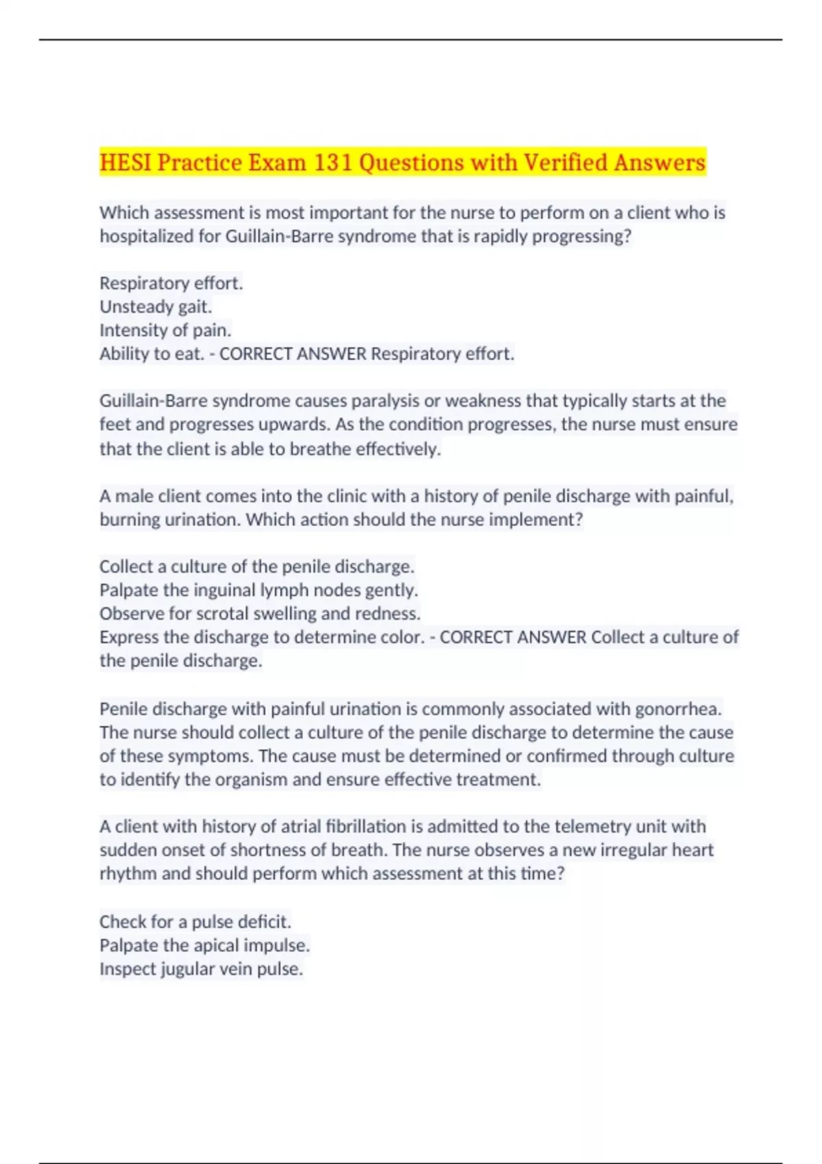 HESI Practice Exam 131 Questions with Verified Answers Which assessment is most important for the nurse to perform on a client who is hospitalized for Guillain-Barre syndrome that is rapidly progressing? Respiratory effort. Unsteady gait. Intensity of pain. Ability to eat. - CORRECT ANSWER Respiratory effort. Guillain-Barre syndrome causes paralysis or weakness that typically starts at the feet and progresses upwards. As the condition progresses, the nurse must ensure that the client is able to breathe effectively. A male client comes into the clinic with a history of penile discharge with painful, burning urination. Which action should the nurse implement? Collect a culture of the penile discharge. Palpate the inguinal lymph nodes gently. Observe for scrotal swelling and redness. Express the discharge to determine color. - CORRECT ANSWER Collect a culture of the penile discharge. Penile discharge with painful urination is commonly associated with gonorrhea. The nurse should collect a culture of the penile discharge to determine the cause of these symptoms. The cause must be determined or confirmed through culture to identify the organism and ensure effective treatment. A client with history of atrial fibrillation is admitted to the telemetry unit with sudden onset of shortness of breath. The nurse observes a new irregular heart rhythm and should perform which assessment at this time? Check for a pulse deficit. Palpate the apical impulse. Inspect jugular vein pulse. Examine for a carotid bruit. - CORRECT ANSWER Check for a pulse deficit. A client with a past history of atrial fibrillation may return to that rhythm. Any signs of atrial fibrillation, such as sudden onset shortness of breath, requires further investigation. The nurse should assess this client for a pulse deficit because this condition occurs with atrial fibrillation. Which client should be further assessed for an ectopic pregnancy? A 24-year-old with shoulder and lower abdominal quadrant pain. A 33-year-old with intermittent lower abdominal cramping. A 20-year-old with fever and right lower abdominal colic. A 40-year-old with jaundice and right lower abdominal pain. - CORRECT ANSWER A 24-year-old with shoulder and lower abdominal quadrant pain. A 24-year-old with sudden onset of lower abdominal quadrant pain should be assessed for an ectopic pregnancy. The pain can also be referred to the shoulder and may be associated with vaginal bleeding. Which dietary assessment finding is most important for the nurse to address when caring for a client with diabetic nephropathy? Drinks a six pack of beer every day. Enjoys a hamburger once a month. Eats fortified breakfast cereal daily. Consumes beans and rice every day. - CORRECT ANSWER Drinks a six pack of beer every day. Drinking six beers every day is the dietary assessment finding most important for the nurse to address when caring for a client with diabetic nephropathy. The usual can of beer is 12 ounces (355 mL). Clients with diabetes are recommended to drink no more than 12 ounces of beer per day because beer contains carbohydrates that can create unhealthy fluctuations in blood glucose and promote poor glucose control. Nephropathy is exacerbated by poor blood glucose control. Which assessment finding is of greatest concern to the nurse who is caring for a client with stomatitis? Cough brought on by swallowing. Sore throat caused by speaking. Painful and dry oral cavity. Unintended weight loss. - CORRECT ANSWER Cough brought on by swallowing. A cough brought on by swallowing is a sign of dysphagia, which is a finding of particular concern in a client with stomatitis. Dysphagia can cause numerous problems, including airway obstruction, and should be reported to the healthcare provider immediately. The nurse is teaching a client diagnosed with peripheral arterial disease. Which genitourinary system complication should the nurse include in the teaching? Altered sexual response. Sterility. Urinary incontinence. Decreased pelvic muscle tone. - CORRECT ANSWER Altered sexual response. Peripheral arterial disease (PAD) is a cardiovascular condition characterized by narrowing of the arteries and reduced blood flow to the extremities. PAD is known to alter the blood flow to the male's penis and is associated with erectile dysfunction in men. A 40-year-old female client has a history of smoking. Which finding should the nurse identify as a risk factor for myocardial infarction? Oral contraceptives. Senile osteopenia. Levothyroxine therapy. Pernicious anemia. - CORRECT ANSWER Oral contraceptives. Women older than 35 years old who smoke and take oral contraceptives have an increased risk of myocardial infarction or stroke. A client has been told that there is cataract formation over both eyes. Which finding should the nurse expect when assessing the client? Decreased color perception. Presence of floaters. Loss of central vision. Reduced peripheral vision. - CORRECT ANSWER Decreased color perception. Decreased color perception occurs with cataract formation. Cataract formation is also associated with blurred vision and a global loss of vision so gradual that the client may not be aware of it. Which assessment finding should most concern the nurse who is monitoring a client two hours after a thoracentesis? New onset of coughing. Low resting heart rate. Distended neck veins. Decreased shallow respirations. - CORRECT ANSWER New onset of coughing. A pneumothorax (partial or complete lung collapse) is the potential complication of a thoracentesis. Manifestations of a pneumothorax include new onset of a nagging cough, tachycardia, and an increased shallow respiration rate. While caring for a client who has esophageal varices, which nursing intervention is most important for the registered nurse (RN) to implement? Monitor infusing IV fluids and any replacement blood products. Prepare for esophagogastroduodenoscopy (EGD). Maintain the client on strict bedrest. Insert a nasogastric tube (NGT) for int