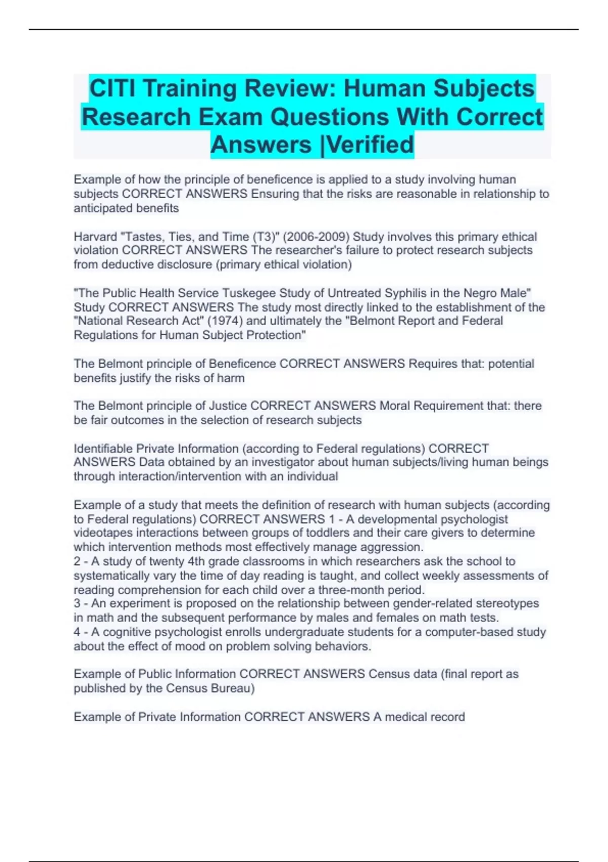 CITI Training Review: Human Subjects Research Exam Questions With Correct Answers |Verified