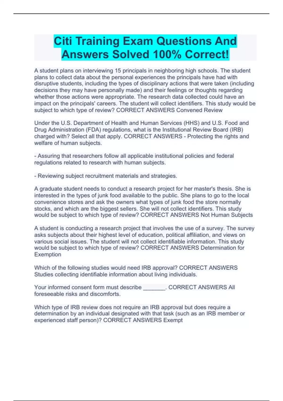Citi Training Exam Questions And Answers Solved 100% Correct!