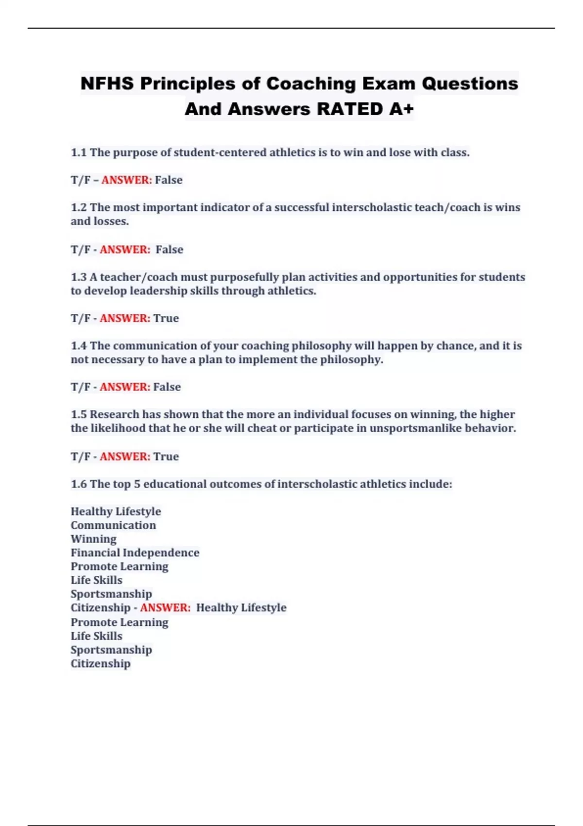 NFHS Principles of Coaching Exam Questions And Answers RATED A+