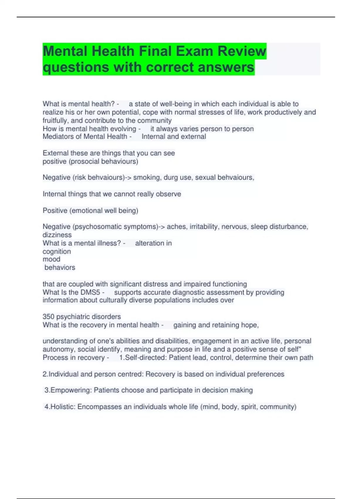 Mental Health Final Exam Review questions with correct answers What is mental health? - a state of well-being in which each individual is able to realize his or her own potential, cope with normal stresses of life, work productively and fruitfully, and contribute to the community How is mental health evolving - it always varies person to person Mediators of Mental Health - Internal and external External these are things that you can see positive (prosocial behaviours) Negative (risk behvaiours)-> smoking, durg use, sexual behvaiours, Internal things that we cannot really observe Positive (emotional well being) Negative (psychosomatic symptoms)-> aches, irritability, nervous, sleep disturbance, dizziness What is a mental illness? - alteration in cognition mood behaviors that are coupled with significant distress and impaired functioning What Is the DMS5 - supports accurate diagnostic assessment by providing information about culturally diverse populations includes over 350 psychiatric disorders What is the recovery in mental health - gaining and retaining hope, understanding of one's abilities and disabilities, engagement in an active life, personal autonomy, social identify, meaning and purpose in life and a positive sense of self" Process in recovery - 1.Self-directed: Patient lead, control, determine their own path 2.Individual and person centred: Recovery is based on individual preferences 3.Empowering: Patients choose and participate in decision making 4.Holistic: Encompasses an individuals whole life (mind, body, spirit, community) 5.Non-linear: Recovery is based on continual growth and occasional setbacks 6.Strengths-based: Builds on multiple capacities, talents, coping abilities 7.Peer-supported; engagement with others 8. Respect: social acceptance, protection of rights, avoid discrimination and stigma 9. Responsibility: personal responsibility for selfcare and recovery 10. Hope: motivating message of a better future What is deinstituilization - The shift from caring for people with mental illness in institutions to caring for them in communities OR Replacing long-stay psychiatric hospitals with less isolated community mental healther services What was the health care reform? - Developments in psychopharmacology Concerns about the civil rights of people with mental illness Need for cost-containment Research revealing the negative impacts of institutionalization What is the MMSE • - 20 point questionnaire that is used to measure severity and progression of cognitive impairments developed in 1975 • Screening for dementia • Takes 5-10 mins What are is examined in the MMSE (RROOLA) - 1. registration 2. attention and calculation 3. recall 4. language 5. obey commands 6. orientation What is the MSE - •a structured way of eval