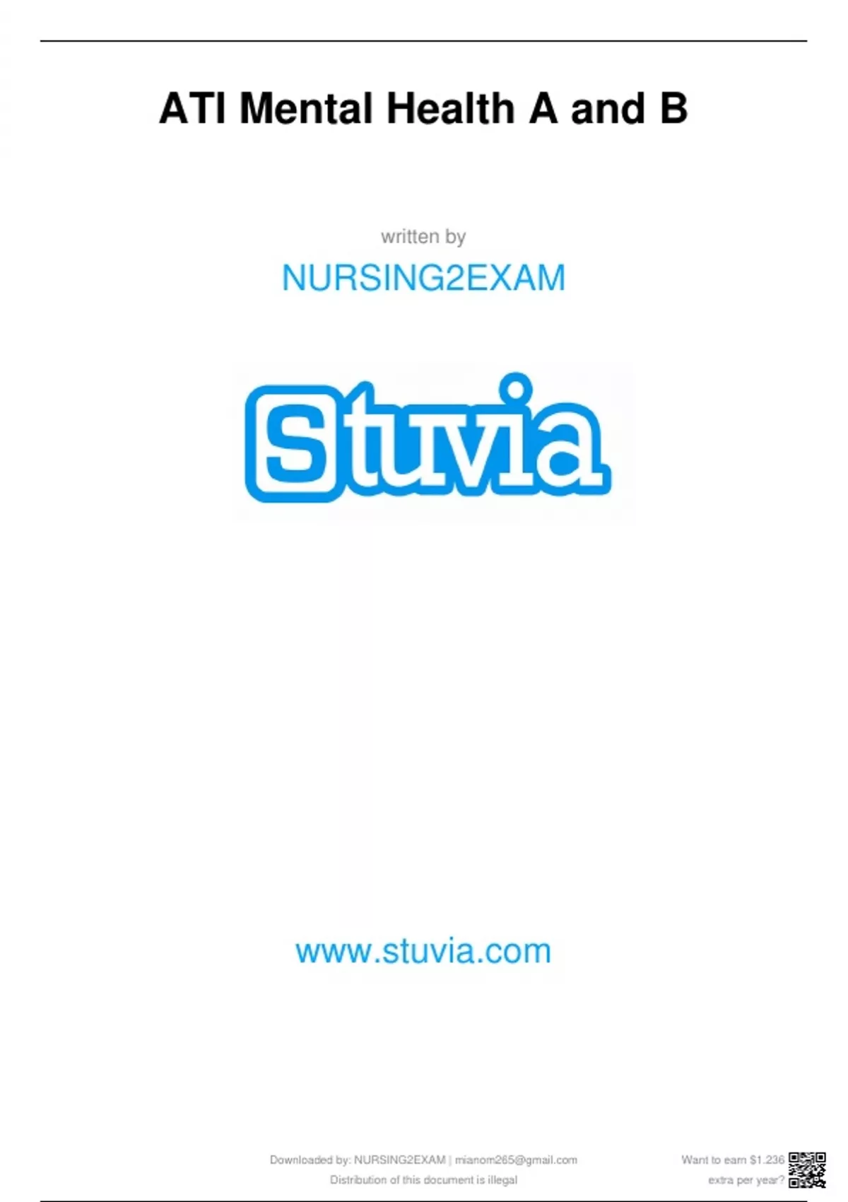 1) A nurse is teaching a client who has schizophrenia about her new prescription for risperidone. Which of the following statements should the nurse include in the teaching? a. “You should continue this medication if you develop muscle rigidity”. b. “You will experience weight loss while taking this medication.” c. “You will notice your symptoms improve within 24 hours of taking this medication.” d. “You should increase your consumption of complex carbohydrates.” 2) A nurse is admitting a client who has generalized anxiety disorder. Which of the following actions should the nurse plan to take first? a. Provide the client with a quiet environment b. Determine how the client handles stress. c. Teach the client to use guided imagery. d. Ask the client to identify her strengths 3) A nurse is conducting an admission interview with a client who is experiencing mania. Which of the following should the nurse report to the provider? a. States that he hasn’t bathed in 2 days b. Reports eating twice in the past two weeks. c. Makesinappropriate sexual comments. d. Speaks in rhyming sentences. 4) A nurse is planning care for a client who has obsessive-compulsive disorder. Which of the following recommendation should the nurse include in the clients plan of care? a. Validation therapy b. Thought stopping c. Operant conditioning d. Reality orientation therapy 5) A nurse is caring for a client who has bipolar disorder and is experiencing a manic episode. Which of the following actions should the nurse take? a. Encourage the client to join group activities b. Dim the lights in the clients room c. Provide detailed explanations to the client d. Administer methylphenidate 6) A nurse is leading a crisis intervention group for adolescents who witnessed the suicide of a classmate. Which of the following actions should the nurse take first. a. Initiate referrals b. Review community resources c. Identify prior coping skills d. Discuss the importance of confidentiality 7) A nurse overhears a client saying, "I am a spy, a spy for the FBI. I am an I, an eye for an eye in the sky. Sky is up high." The nurse should document the client's statement as which of the following speech alterations? a. Echolalia b. Word salad c. Neologism d. Clang association 8) An older adult client is brought to the mental health clinic by her daughter. The daughter reports that her mother is not eating and seems uninterested in routine activities. The daughter states "I'm so worried that my mother is depressed" which of the following responses should the nurse make? a. Everyone gets depressed from time to time. b. You shouldn't worry about this because depressive disorder is easily treated. c. Older adults are usually diagnosed with depressive disorder as they age. d. Tell me the reasons you think your mother is depressed. 9) A nurse is planning care for an adolescent who has autism spectrum disorder. Which of the following outcomes should the nurse include in the plan care? a. Meets own needs without manipulating others. b. Initiates social interactions with caregivers