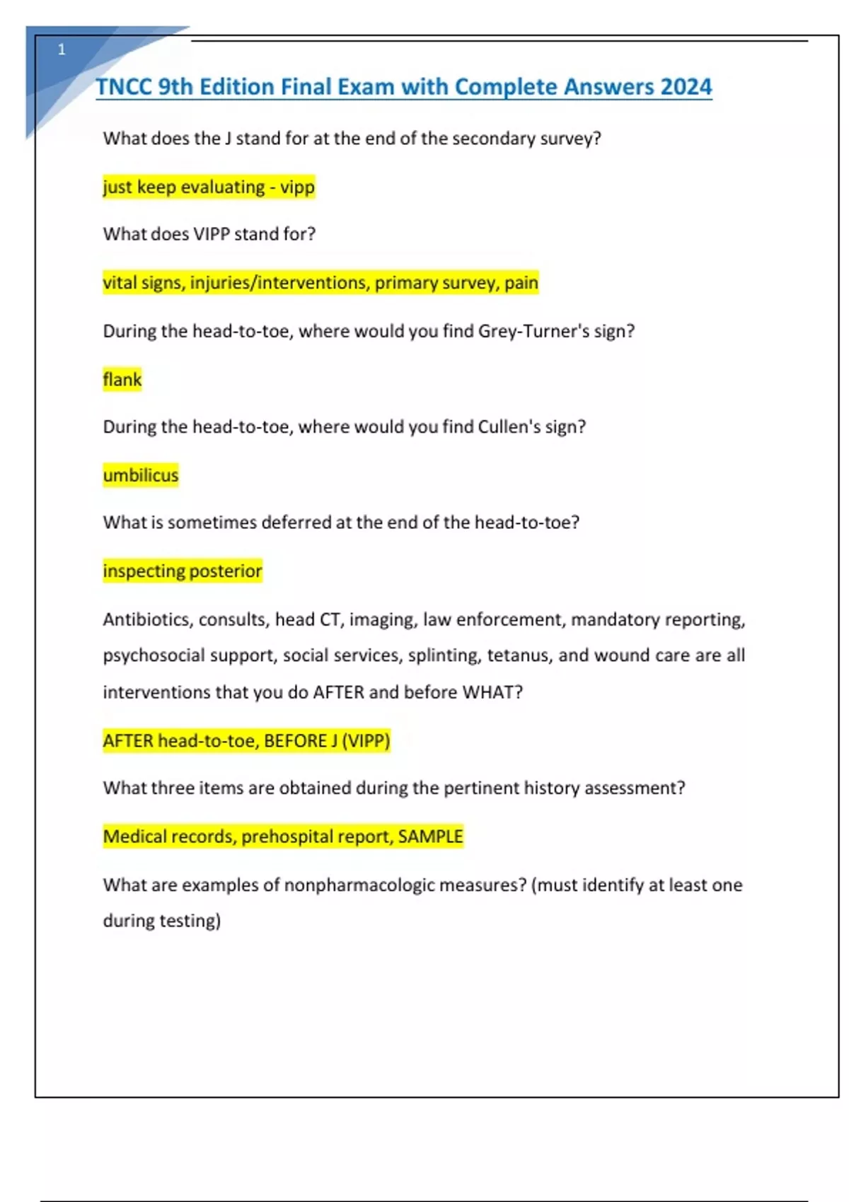 TNCC 9th Edition Final Exam with Complete Answers 2024.