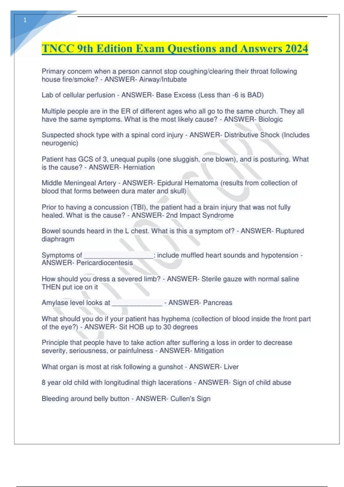 TNCC 9th Edition Exam Questions and Answers 2024.