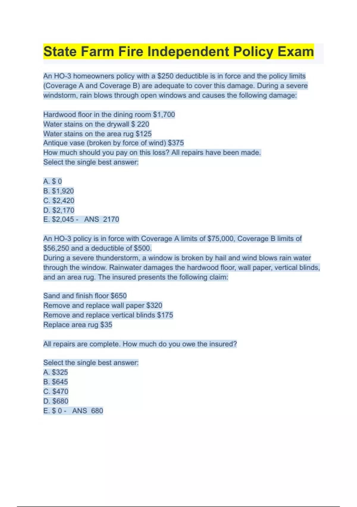 State Farm Fire Independent Policy Exam QUESTIONS & ANSWERS 2024 ( A+ GRADED 100% VERIFIED)