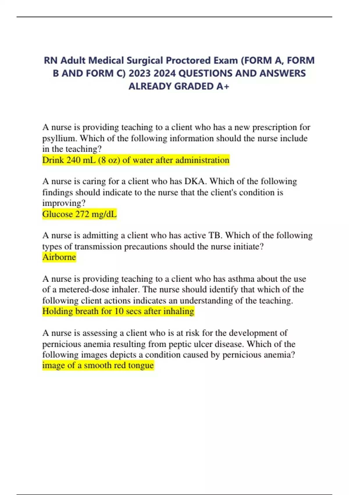 RN Adult Medical Surgical Proctored Exam (FORM A, FORM B AND FORM C) QUESTIONS AND ANSWERS ALREADY GRADED A+
