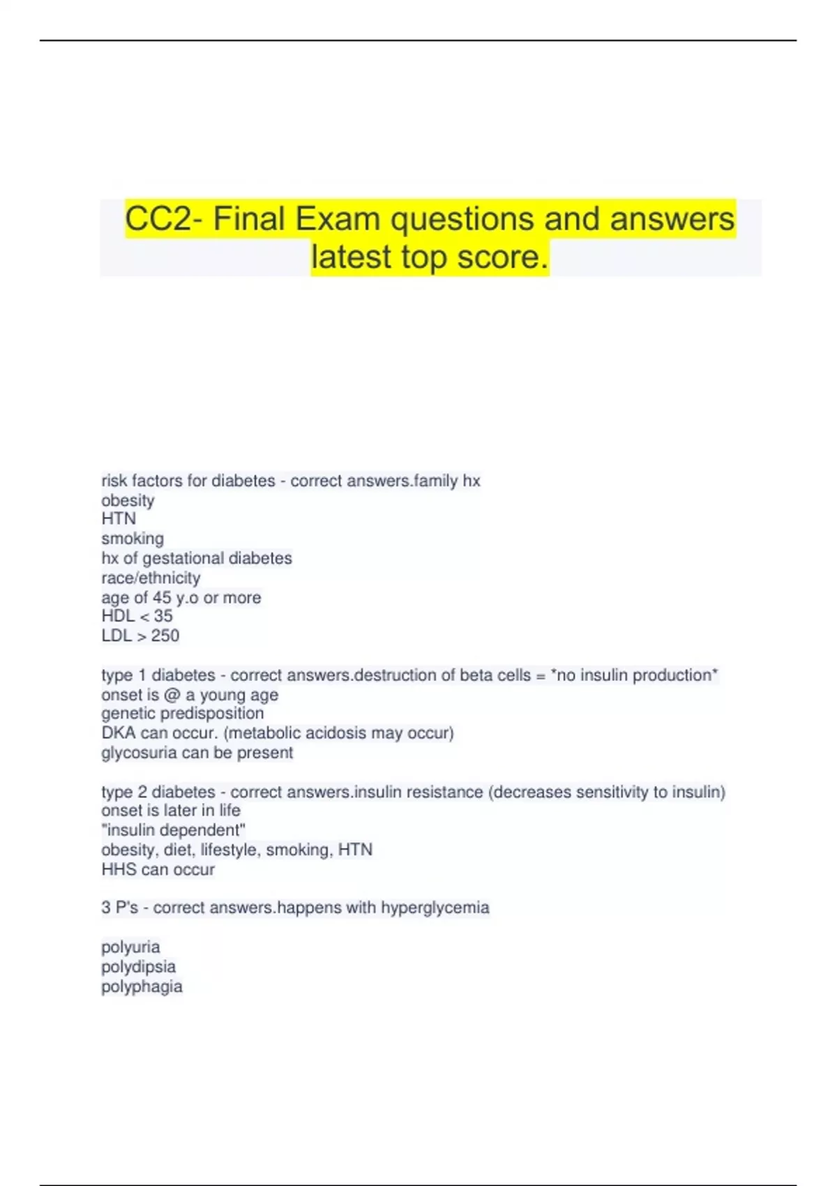 CC2- Final Exam questions and answers latest top score. risk factors for diabetes - correct y hx obesity HTN smoking hx of gestational diabetes race/ethnicity age of 45 y.o or more HDL < 35 LDL > 250 type 1 diabetes - correct uction of beta cells = *no insulin production* onset is @ a young age genetic predisposition DKA can occur. (metabolic acidosis may occur) glycosuria can be present type 2 diabetes - correct in resistance (decreases sensitivity to insulin) onset is later in life "insulin dependent" obesity, diet, lifestyle, smoking, HTN HHS can occur 3 P's - correct ns with hyperglycemia polyuria polydipsia polyphagia hypoglycemia S+S - correct answers.(less than 70) sweaty lightheadedness shaky/weak hungry headache confusion hyperglycemia S+S - correct answers.(more than 120) 3 P's (polyuria, polydipsia, polyphagia) slow healing process blurred vision tiredness leg cramps microvascular complications associated w/ diabetes - correct opathy, neuropathy, and retinopathy diabetic nephropathy - correct ienced more by Type 2 pts. high levels of BS overwhelm the kidneys, protein (ex. albumin) leaks into the urine, pressure in the vessels of kidneys increase. management: control HTN, prevent UTIs, avoid contrast dyes/toxic medications, low sodium low protein diet. peripheral diabetic neuropathy - correct ts distal portions of nerves, especially in lower extremities. S+S: parasthesia, burning sensation, pain in lower extremities, feet become numb, decreased sensation to touch, decrease in deep tendon reflexes management: control of BBG, pain management (gabapentin) diabetic retinopathy - correct es in small blood vessels in the retina (macular edema... eventually vision loss occurs) recommend frequent eye exams 3 macrovascular complications associated w/ diabetes - correct ary artery disease, cerebrovascular disease, and peripheral vascular disease (PVD) DKA - correct common in type 1 DM onset is rapid glucose level > 250