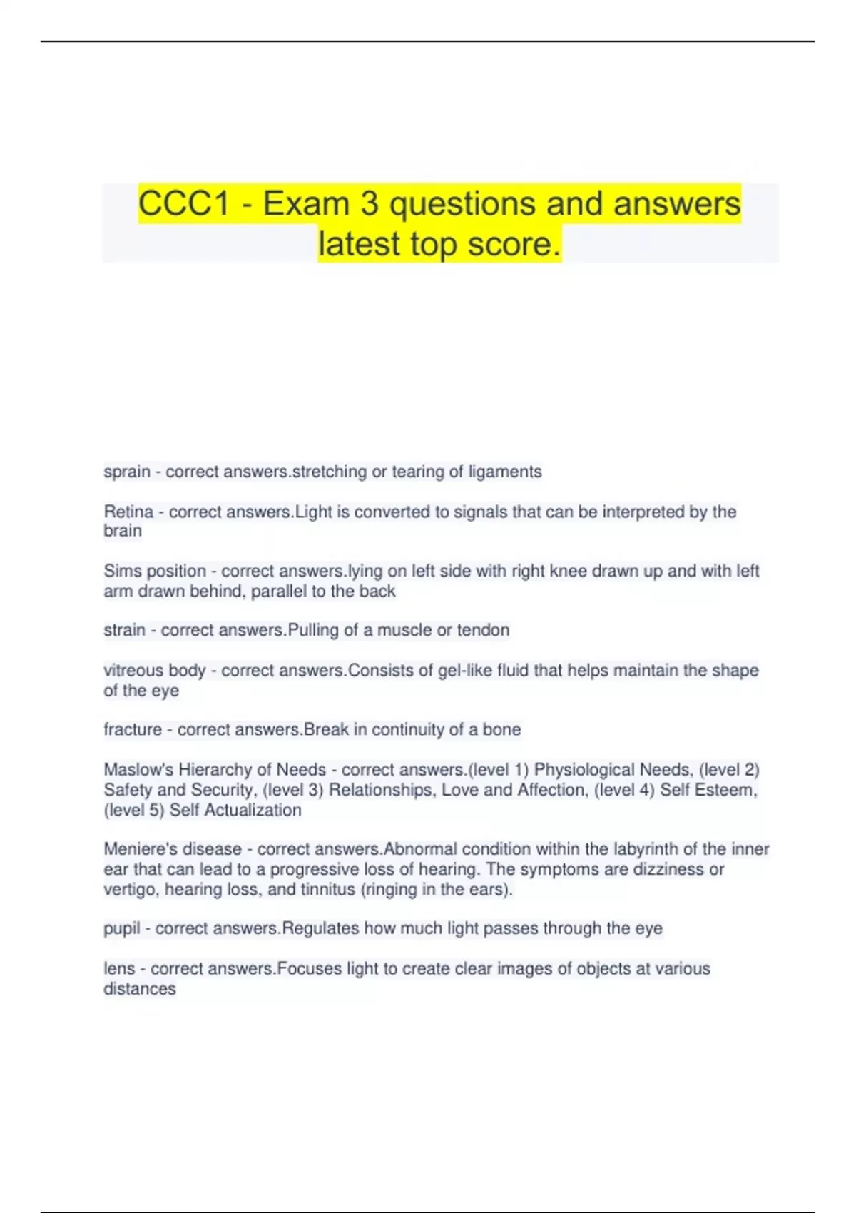 CCC1 - Exam 3 questions and answers latest top score. sprain - correct ching or tearing of ligaments Retina - correct answers.Light is converted to signals that can be interpreted by the brain Sims position - correct on left side with right knee drawn up and with left arm drawn behind, parallel to the back strain - correct answers.Pulling of a muscle or tendon vitreous body - correct answers.Consists of gel-like fluid that helps maintain the shape of the eye fracture - correct answers.Break in continuity of a bone Maslow's Hierarchy of Needs - correct answers.(level 1) Physiological Needs, (level 2) Safety and Security, (level 3) Relationships, Love and Affection, (level 4) Self Esteem, (level 5) Self Actualization Meniere's disease - correct answers.Abnormal condition within the labyrinth of the inner ear that can lead to a progressive loss of hearing. The symptoms are dizziness or vertigo, hearing loss, and tinnitus (ringing in the ears). pupil - correct answers.Regulates how much light passes through the eye lens - correct answers.Focuses light to create clear images of objects at various distances