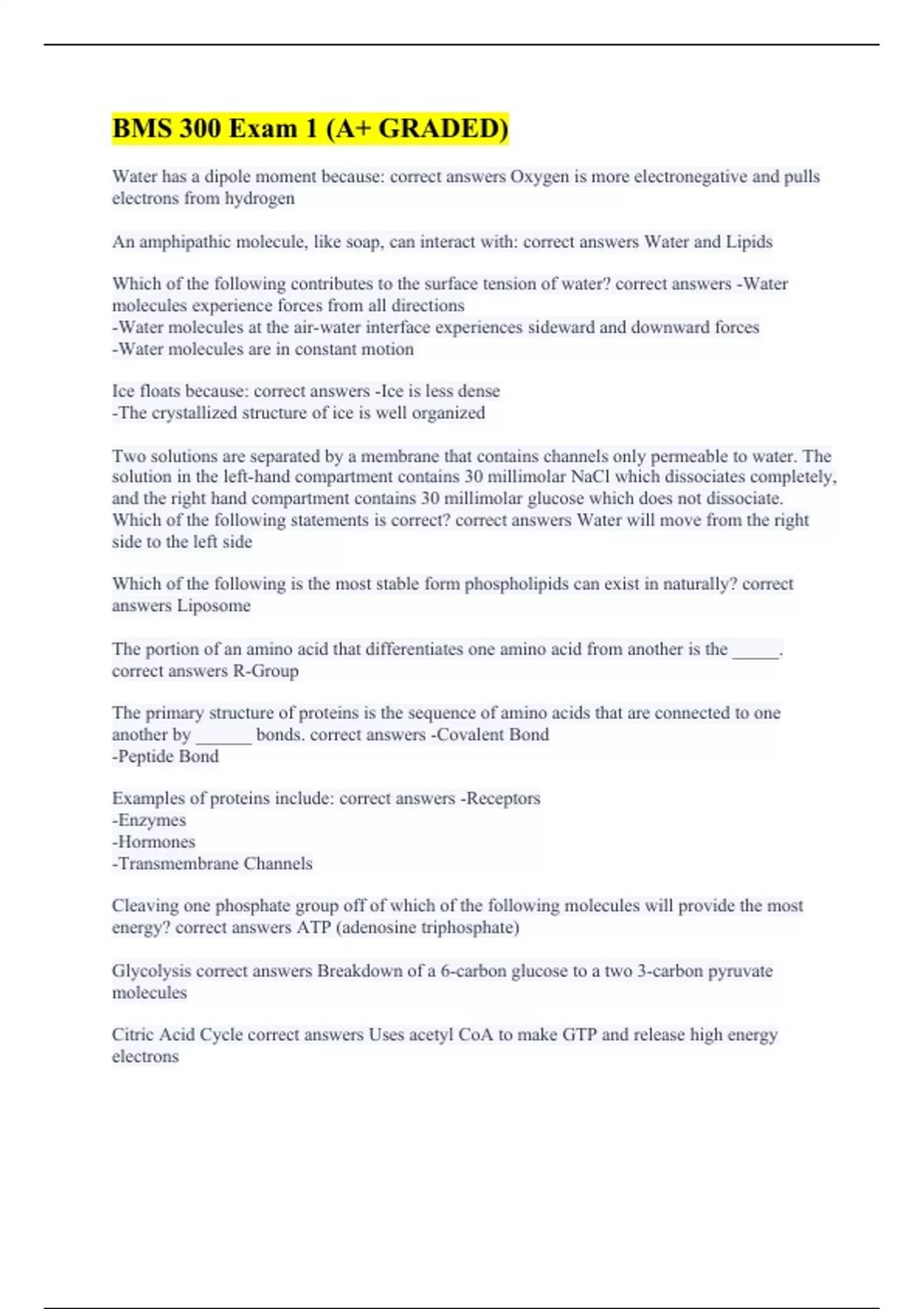Water has a dipole moment because: correct answers Oxygen is more electronegative and pulls electrons from hydrogen An amphipathic molecule, like soap, can interact with: correct answers Water and Lipids Which of the following contributes to the surface tension of water? correct answers -Water molecules experience forces from all directions -Water molecules at the air-water interface experiences sideward and downward forces -Water molecules are in constant motion Ice floats because: correct answers -Ice is less dense -The crystallized structure of ice is well organized Two solutions are separated by a membrane that contains channels only permeable to water. The solution in the left-hand compartment contains 30 millimolar NaCl which dissociates completely, and the right hand compartment contains 30 millimolar glucose which does not dissociate. Which of the following statements is correct? correct answers Water will move from the right side to the left side Which of the following is the most stable form phospholipids can exist in naturally? correct answers Liposome The portion of an amino acid that differentiates one amino acid from another is the _____. correct answers R-Group The primary structure of proteins is the sequence of amino acids that are connected to one another by ______ bonds. correct answers -Covalent Bond -Peptide Bond Examples of proteins include: correct answers -Receptors -Enzymes -Hormones -Transmembrane Channels Cleaving one phosphate group off of which of the following molecules will provide the most energy? correct answers ATP (adenosine triphosphate) Glycolysis correct answers Breakdown of a 6-carbon glucose to a two 3-carbon pyruvate molecules Citric Acid Cycle correct answers Uses acetyl CoA to make GTP and release high energy electrons