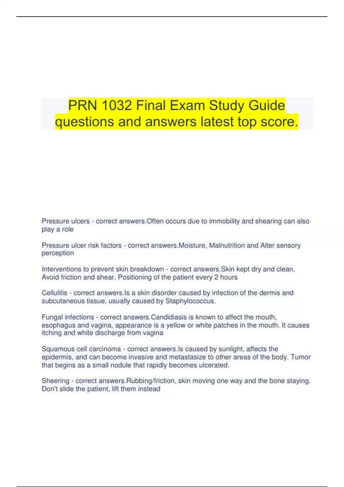 PRN 1032 Final Exam Study Guide questions and answers latest top score. Pressure ulcers - correct answers.Often occurs due to immobility and shearing can also play a role Pressure ulcer risk factors - correct answers.Moisture, Malnutrition and Alter sensory perception Interventions to prevent skin breakdown - correct answers.Skin kept dry and clean, Avoid friction and shear, Positioning of the patient every 2 hours Cellulitis - correct answers.Is a skin disorder caused by infection of the dermis and subcutaneous tissue, usually caused by Staphylococcus. Fungal infections - correct answers.Candidiasis is known to affect the mouth, esophagus and vagina, appearance is a yellow or white patches in the mouth. It causes itching and white discharge from vagina Squamous cell carcinoma - correct answers.Is caused by sunlight, affects the epidermis, and can become invasive and metastasize to other areas of the body. Tumor that begins as a small nodule that rapidly becomes ulcerated. Sheering - correct answers.Rubbing/friction, skin moving one way and the bone staying. Don't slide the patient, lift them instead Burn injuries - correct ies to the skin caused by exposure to extreme heat, hot liquids, electrical agents, strong chemicals, or radiation Burn diet - correct answers.High calorie, high protein, and vitamins C and Zinc to assist in healing Acne types - correct answers.Acne rosacea begins between age 30- 50 years; characterized by erythema(redness), papules, pustules, and telangiectasias. Acne vulgaris begins early puberty; factors that contribute to it are hereditary disposition, increased androgen levels, and premenstrual hormonal fluctuations Acne diet - correct answers.Important to eat healthy-well balanced diet. May be caused by fatty/greasy foods Types of inmmunity - correct answers.Active artificially acquired immunity occurs via immunization. E.g: Flu vaccinations Passive natural immunity occurs transmission of mother to baby. E.g: Mother to baby, Utero, Breast milk First line of defense - correct intact skin against harmful environmental agents. Skin functions as a protective barrier for the underlying tissues, helping maintain integrity. Sebaceous glands excrete sweat, lactic acid, and fatty acids to limit microbial growth Second line of defense - correct fever (slows the growth of pathogens), leukocytosis, phagocytosis, inflammation, and the action of interferon (biologic response modifier that affects cellular growth). Third line of defense - correct immune response of (WBCs) against pathogenic organisms. Microorganisms and other substances that do not belong in the body, such as pollen, are recognized as foreign invaders and trigger an immune response (the body's reaction to substances interpreted as nonself). Passive natural inmmunity - correct answers.Transmission of mother to baby Hand washing - correct answers.Perform before/after handling a patient. Switch gloves/wash hands in between tasks/before leaving patients room. At least 15-30 seconds Intervention to prevent respiratory complications - correct answers.Reposition every 2 hours Turn, cough and breathe deeply every 1-2 hours Yawn every hour Use incentives spirometer Auscultate lungs