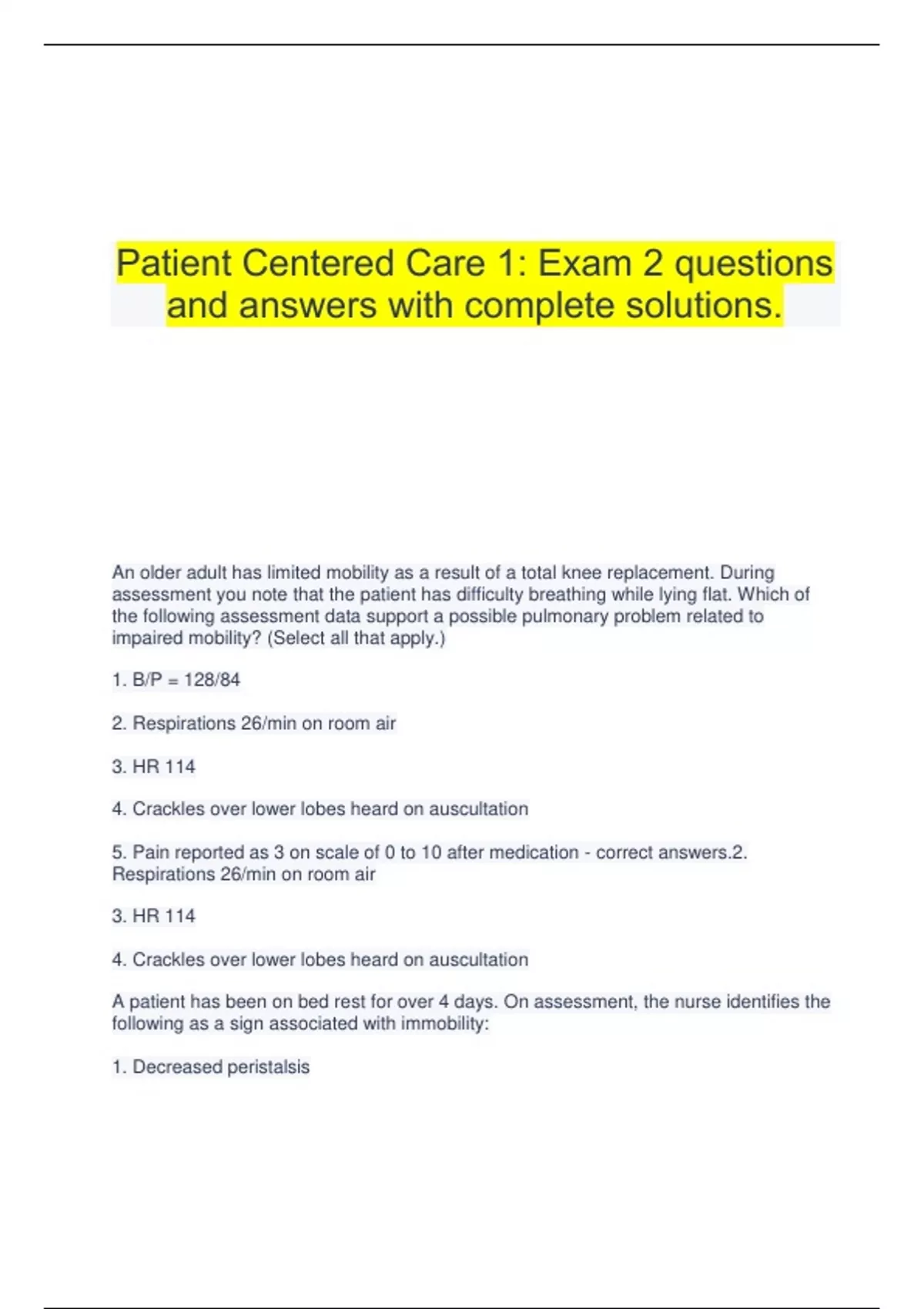 Patient Centered Care 1: Exam 2 questions and answers with complete solutions. An older adult has limited mobility as a result of a total knee replacement. During assessment you note that the patient has difficulty breathing while lying flat. Which of the following assessment data support a possible pulmonary problem related to impaired mobility? (Select all that apply.) 1. B/P = 128/84 2. Respirations 26/min on room air 3. HR 114 4. Crackles over lower lobes heard on auscultation 5. Pain reported as 3 on scale of 0 to 10 after medication - correct answers.2. Respirations 26/min on room air 3. HR 114 4. Crackles over lower lobes heard on auscultation A patient has been on bed rest for over 4 days. On assessment, the nurse identifies the following as a sign associated with immobility: 1. Decreased peristalsis 2. Decreased heart rate 3. Increased blood pressure 4. Increased urinary output - correct answers.1. Decreased peristalsis The nurse puts elastic stockings on a patient following major abdominal surgery. The nurse teaches the patient that the stockings are used after a surgical procedure to __________________________. - correct answers.Promote venous return to the heart A nurse is teaching a community group about ways to minimize the risk of developing osteoporosis. Which of the following statements reflect understanding of what was taught? (Select all that apply.) 1. "I usually go swimming with my family at the YMCA 3 times a week." 2. "I need to ask my doctor if I should have a bone mineral density check this year." 3. "If I don't drink milk at dinner, I'll eat broccoli or cabbage to get the calcium that I need in my diet." 4. "I'll check the label of my multivitamin. If it has calcium, I can save money by not taking another pill." 5. "My lactose intolerance should not be a concern when considering my calcium intake." - correct answers.1. "I usually go swimming with my family at the YMCA 3 times a week." 2. "I need to ask my doctor if I should have a bone mineral density check this year." 3. "If I don't drink milk at dinner, I'll eat broccoli or cabbage to get the calcium that I need in my diet." A nurse is caring for an older adult who has had a fractured hip repaired. In the first few postoperative days, which of the following nursing measures will best facilitate the resumption of activities of daily living for this patient? 1. Encouraging use of an overhead trapeze for positioning and transfer 2. Frequent family visits 3. Assisting the patient to a wheelchair once per day 4. Ensuring that there is an order for physical therapy - correct answers.1. Encouraging use of an overhead trapeze for positioning and transfer