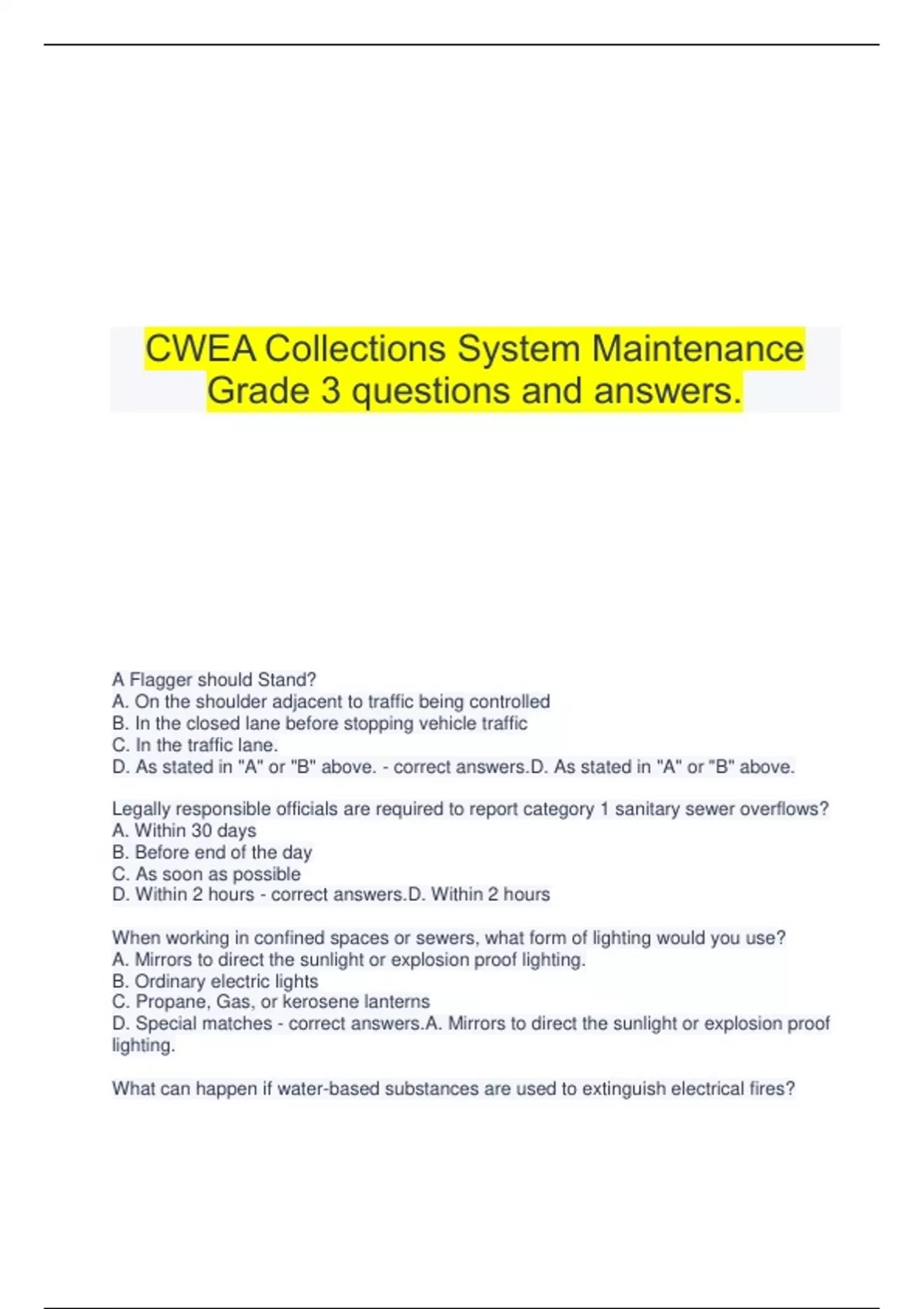 CWEA Collections System Maintenance Grade 3 questions and answers. A Flagger should Stand? A. On the shoulder adjacent to traffic being controlled B. In the closed lane before stopping vehicle traffic C. In the traffic lane. D. As stated in "A" or "B" above. - correct answers.D. As stated in "A" or "B" above. Legally responsible officials are required to report category 1 sanitary sewer overflows? A. Within 30 days B. Before end of the day C. As soon as possible D. Within 2 hours - correct answers.D. Within 2 hours When working in confined spaces or sewers, what form of lighting would you use? A. Mirrors to direct the sunlight or explosion proof lighting. B. Ordinary electric lights C. Propane, Gas, or kerosene lanterns D. Special matches - correct answers.A. Mirrors to direct the sunlight or explosion proof lighting. What can happen if water-based substances are used to extinguish electrical fires? a. Nothing but extinguish the fire b. The fumes are not harmful c. Receive an electrical shock d. They will corrode the electrical contacts - correct answers.c. Receive an electrical shock When testing a manhole for explosive gases when should the first tests be made? a. After removing the manhole cover b. Before removing the manhole cover c. At any time d. After ventilation - correct answers.b. Before removing the manhole cover Atmospheric hazards encountered in manholes can include: a. non-explosive atmospheres. b. non-toxic atmosphere. c. lack of oxygen. d. non-flammable atmospheres. - correct answers.c. lack of oxygen. When setting up to ventilate a manhole, the air inlet should be how many feet above street level? a. 4.0 b. 3.0 c. 2.0 d. 1.0 - correct answers.c. 2.0 Which chemical may be used for odor control in a sewer system? a. Calcium chloride b. Hydrogen peroxide c. Oxidized aluminum d. Sodium chloride - correct answers.b. Hydrogen peroxide What information must be on a warning tag attached to a switch that has been locked out? a. Directions for removing tag. b. Name of nearest physician to call in case of emergency. c. Signature of person who locked out switch and who is the only person authorized to remove tag. d. Time to unlock switch. - correct answers.c. Signature of person who locked out switch and who is the only person authorized to remove tag. Under what conditions must each member of the rescue service practice permit space rescues? a. At least once a year in a simulated situation or by the satisfactory performance of an actual rescue. b. At least twice a year in simulated situations. c. At least once a year in simulated situation using non-representative space conditions