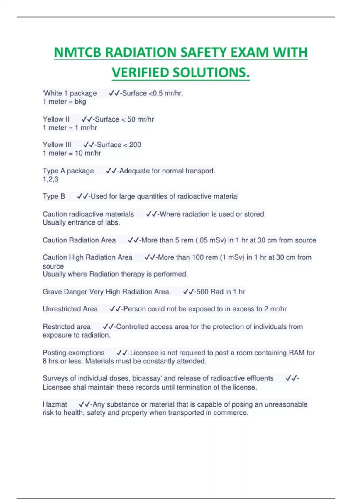 NMTCB RADIATION SAFETY EXAM WITH VERIFIED SOLUTIONS.