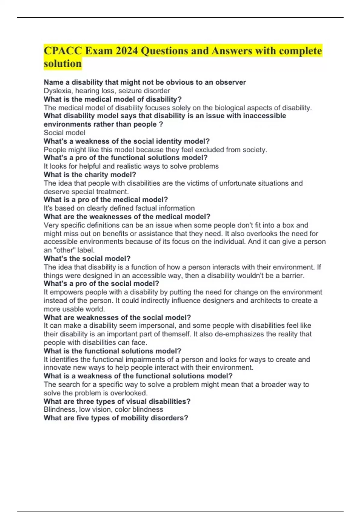 CPACC Exam 2024 Questions and Answers with complete solution Name a disability that might not be obvious to an observer Dyslexia, hearing loss, seizure disorder What is the medical model of disability? The medical model of disability focuses solely on the biological aspects of disability. What disability model says that disability is an issue with inaccessible environments rather than people ? Social model What's a weakness of the social identity model? People might like this model because they feel excluded from society. What's a pro of the functional solutions model? It looks for helpful and realistic ways to solve problems What is the charity model? The idea that people with disabilities are the victims of unfortunate situations and deserve special treatment. What is a pro of the medical model? It's based on clearly defined factual information What are the weaknesses of the medical model? Very specific definitions can be an issue when some people don't fit into a box and might miss out on benefits or assistance that they need. It also overlooks the need for accessible environments because of its focus on the individual. And it can give a person an "other" label. What's the social model? The idea that disability is a function of how a person interacts with their environment. If things were designed in an accessible way, then a disability wouldn't be a barrier. What's a pro of the social model? It empowers people with a disability by putting the need for change on the environment instead of the person. It could indirectly influence designers and architects to create a more usable world. What are weaknesses of the social model? It can make a disability seem impersonal, and some people with disabilities feel like their disability is an important part of themself. It also de-emphasizes the reality that people with disabilities can face. What is the functional solutions model? It identifies the functional impairments of a person and looks for ways to create and innovate new ways to help people interact with their environment. What is a weakness of the functional solutions model? The search for a specific way to solve a problem might mean that a broader way to solve the problem is overlooked. What are three types of visual disabilities? Blindness, low vision, color blindness What are five types of mobility disorders? Manual dexterity/fine motor control, ambulation, muscle fatigue, body size, body shape and form What are some types of cognitive disorders? Intellectual, memory, reading, math comprehension, ADHD, learning, dyslexia, language, autism What are the two types of seizure disorders? Photosensitive and general seizure disorder What are three types of psychological disorders? Social, emotional, and behavioral What is the economic model? It defines disability by a person's ability to work What are pros of the economic model? It recognizes that some people will need modifications to their work environment and also that individuals who can't work may need financial assistance What are the cons of the economic model? It creates a specific standard for disability that a person has to meet, and it also can be stigmatizing What is the definition of perceivable? Making the output of web content available in multiple ways so different users can access it What is the definition of operable? Making the input methods for web content accessible to all users What's the definition of understandable? Making UI and content that everyone can comprehend What are ways to make a web product more understandable? Declaring the language of a page, checking/simplifying the reading level, explaining technical concepts and jargon, writing out the full name for acronyms and abbreviations the first time they're used, provide images or audio versions of the content, having a consistent layout, give clear instructions and error messages What's the definition of robust? Making sure there's compatibility with a variety of ways a user could interact with the content What are ways to make a site or product's code more robust? Use standard HTML markup and ARIA What are ways to make a site or product more perceivable? Make sure every non-text element has a text alternative and use ARIA How can you make a product or site more operable? Make sure that a person can use the site or product with whatever method works best for them by testing with different methods, only using JS elements when necessary, controlling the focus, giving users enough time to complete a task What are the 3 Universal Designs for Learning principles? 1. provide multiple means of representation 2. provide multiple means of action and expression 3. provide multiple means of engagement How can you provide multiple means of representation? Ensure different options are used to deliver information to students so students with disabilities and different learning styles have the same access to education What are ways to provide multiple means of action and expression? Give students different options for showing the knowledge they've gained. Some students will be good at quizzes and tests, but others will be better at projects or presentations. How can an instructor provide multiple means of engagement? Help students remember and process information so it will stay in their memories. Give students the chance to personalize what they're learning so they want to be involved. Help them keep their attention on the subject through collaboration and feedback. What's the Universal Declaration of Human Rights? A document created by the UN in 1948 that created the first list of global basic human rights What's the Convention on the Rights of Persons with Disabilities? A UN human rights treaty that was adopted in 2006 and went into effect in 2008, which was designed to change the way people with disabilities are looked at from objects in need of charity and medical diagnoses to subjects with rights and freedom. 163 countries have signed it and 181 have ratified it. In 2
