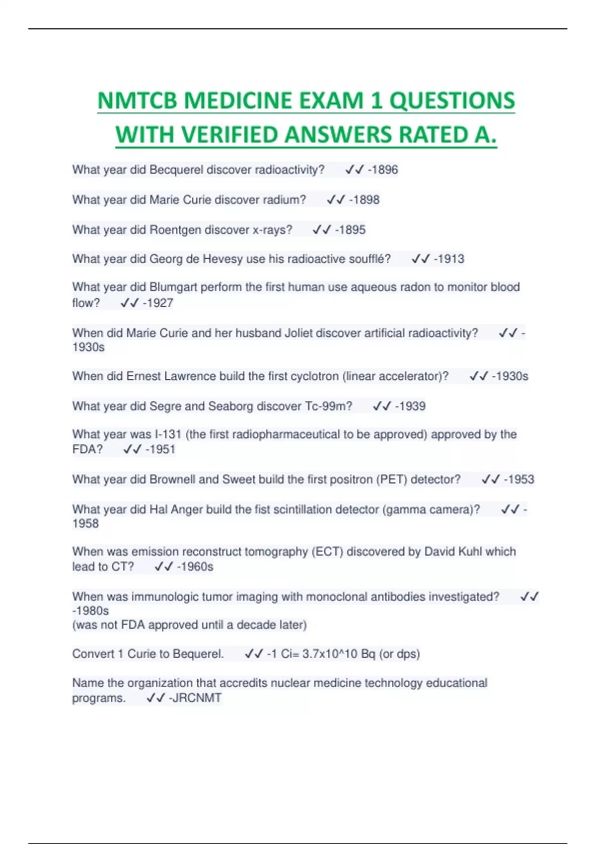 NMTCB MEDICINE EXAM 1 QUESTIONS WITH VERIFIED ANSWERS RATED A.