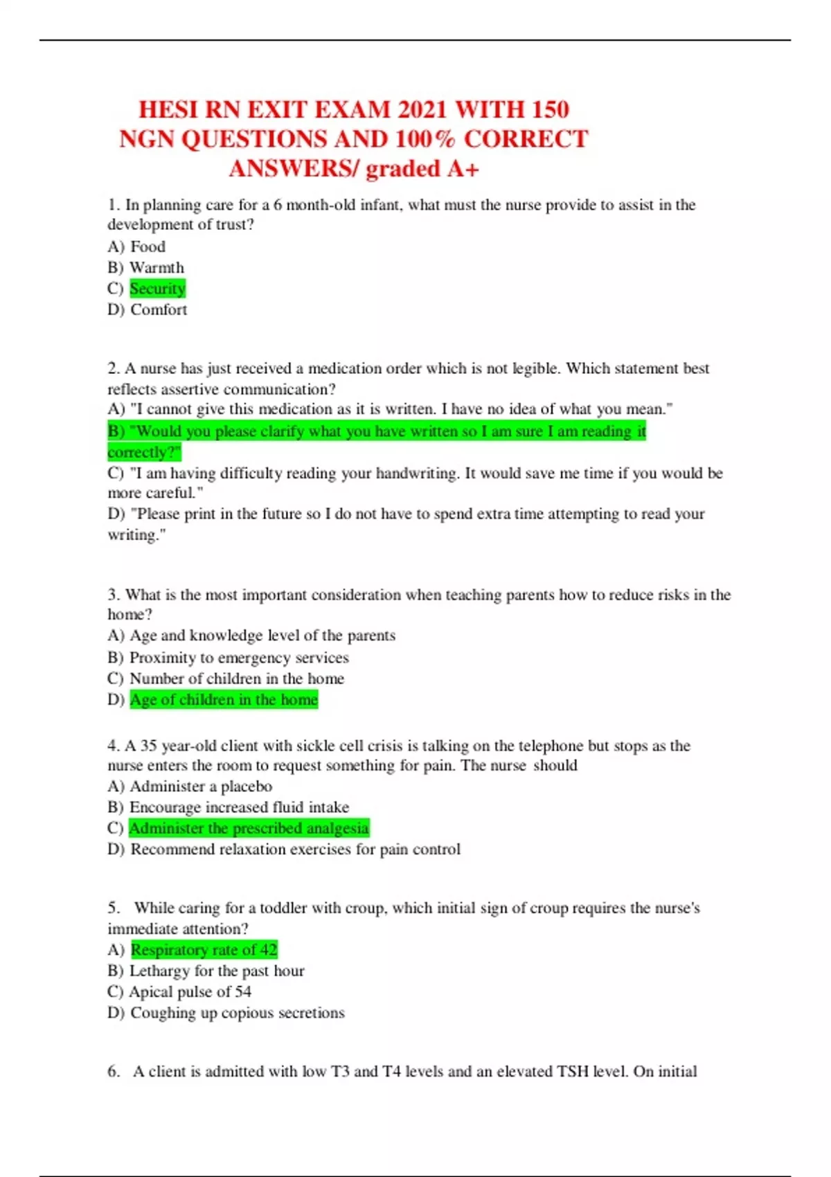 HESI RN EXIT EXAM 2021 WITH 150 NGN QUESTIONS AND 100% CORRECT ANSWERS/ graded A+ 1. In planning care for a 6 month-old infant, what must the nurse provide to assist in the development of trust? A) Food B) Warmth C) Security D) Comfort 2. A nurse has just received a medication order which is not legible. Which statement best reflects assertive communication? A) "I cannot give this medication as it is written. I have no idea of what you mean." B) "Would you please clarify what you have written so I am sure I am reading it correctly?" C) "I am having difficulty reading your handwriting. It would save me time if you would be more careful." D) "Please print in the future so I do not have to spend extra time attempting to read your writing." 3. What is the most important consideration when teaching parents how to reduce risks in the home? A) Age and knowledge level of the parents B) Proximity to emergency services C) Number of children in the home D) Age of children in the home 4. A 35 year-old client with sickle cell crisis is talking on the telephone but stops as the nurse enters the room to request something for pain. The nurse should A) Administer a placebo B) Encourage increased fluid intake C) Administer the prescribed analgesia D) Recommend relaxation exercises for pain control
