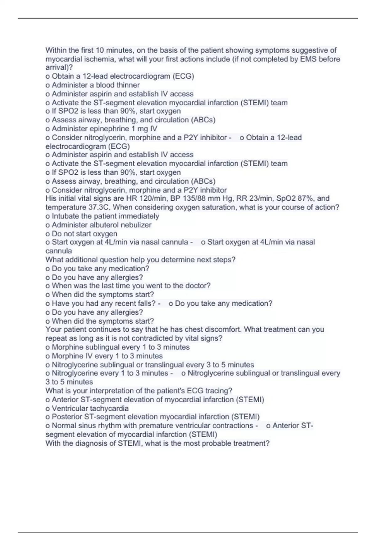 Within the first 10 minutes, on the basis of the patient showing symptoms suggestive of myocardial ischemia, what will your first actions include (if not completed by EMS before arrival)? o Obtain a 12-lead electrocardiogram (ECG) o Administer a blood thinner o Administer aspirin and establish IV access o Activate the ST-segment elevation myocardial infarction (STEMI) team o If SPO2 is less than 90%, start oxygen o Assess airway, breathing, and circulation (ABCs) o Administer epinephrine 1 mg IV o Consider nitroglycerin, morphine and a P2Y inhibitor - o Obtain a 12-lead electrocardiogram (ECG) o Administer aspirin and establish IV access o Activate the ST-segment elevation myocardial infarction (STEMI) team o If SPO2 is less than 90%, start oxygen o Assess airway, breathing, and circulation (ABCs) o Consider nitroglycerin, morphine and a P2Y inhibitor