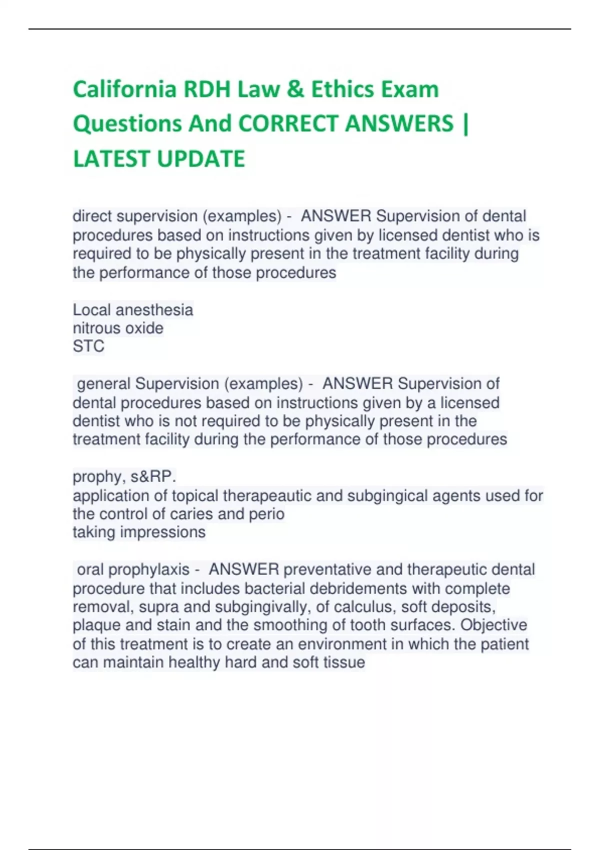 California RDH Law & Ethics Exam Questions And CORRECT ANSWERS | LATEST UPDATE direct supervision (examples) - ANSWER Supervision of dental procedures based on instructions given by licensed dentist who is required to be physically present in the treatment facility during the performance of those procedures Local anesthesia nitrous oxide STC general Supervision (examples) - ANSWER Supervision of dental procedures based on instructions given by a licensed dentist who is not required to be physically present in the treatment facility during the performance of those procedures prophy, s&RP. application of topical therapeautic and subgingical agents used for the control of caries and perio taking impressions oral prophylaxis - ANSWER preventative and therapeutic dental procedure that includes bacterial debridements with complete removal, supra and subgingivally, of calculus, soft deposits, plaque and stain and the smoothing of tooth surfaces. Objective of this treatment is to create an environment in which the patient can maintain healthy hard and soft tissue what shall the licensee report based on employment status (7) - ANSWER 1- full-time practice for appointment and a dental or dental hygiene practice for 32 hours per week or more in California 2- full-time practice for appointment and a dental or dental hygiene purpose of 32 hours or more outside of California 3- part time practice or appointment and they dental or dental hygiene practice for less than 32 hours per week in California 4- part time practice or appointment and a dental or dental hygiene practice for less than 32 hours per week outside of California 5- dental hygiene administrative employment that does not include direct patient care as may be further defined by the committee 6- retired 7- other practice or employment status as may be further defined by the committee What are the committees functions? - ANSWER Verify licensing education discipline diversions and make laws t or f: All functions that may be performed by a RDA are able to be performed by a RDH - ANSWER f: all RDH registered prior to dec. 31, 2005 can perform all RDA functions all RDH registered on or after jan. 1, 2006 must qualify and receive RDA license to fulfill duties What functions can a RDH practice - ANSWER ADPIE: Assessment development planning implementation education counseling and screening what are some functions a RDH can not practice - ANSWER Signals and comprehensive treatment planning Placing, convincing, carving, or removal of permanent restorations Surgery or cutting on hard and soft tissue including but not limited to the removal of teeth and the cutting and suturing of soft tissue Prescribing medication Administering local or general anesthesia or oral or parental conscious sedation, except for the administration of nitrous oxide and oxygen, whether administration alone or in combination with each other, or local anesthesia pursuant to section t or f: the state of California. Dental hygienist and determine what radiographs to perform on a patient who has not received an initial examination by the supervising dentist for the specific purpose of the dentist making a diagnosis or treatment plan for the patient - ANSWER t