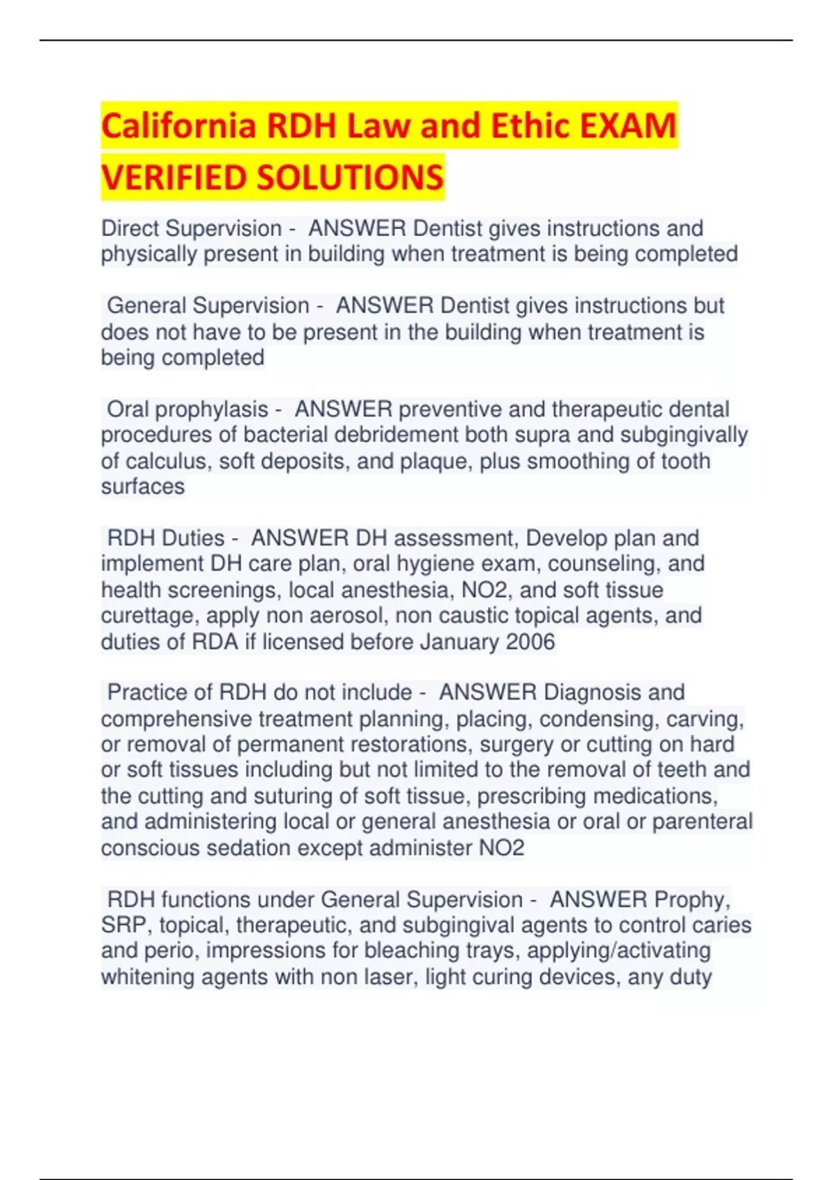 California RDH Law and Ethic EXAM VERIFIED SOLUTIONS