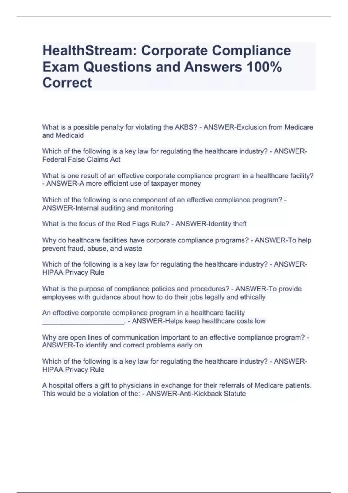 HealthStream: Corporate Compliance Exam Questions and Answers 100% Correct HealthStream: Corporate Compliance Exam Questions and Answers 100% Correct HealthStream: Corporate Compliance Exam Questions and Answers 100% Correct What is a possible penalty for violating the AKBS? - ANSWER-Exclusion from Medicare and Medicaid Which of the following is a key law for regulating the healthcare industry? - ANSWER-Federal False Claims Act What is one result of an effective corporate compliance program in a healthcare facility? - ANSWER-A more efficient use of taxpayer money