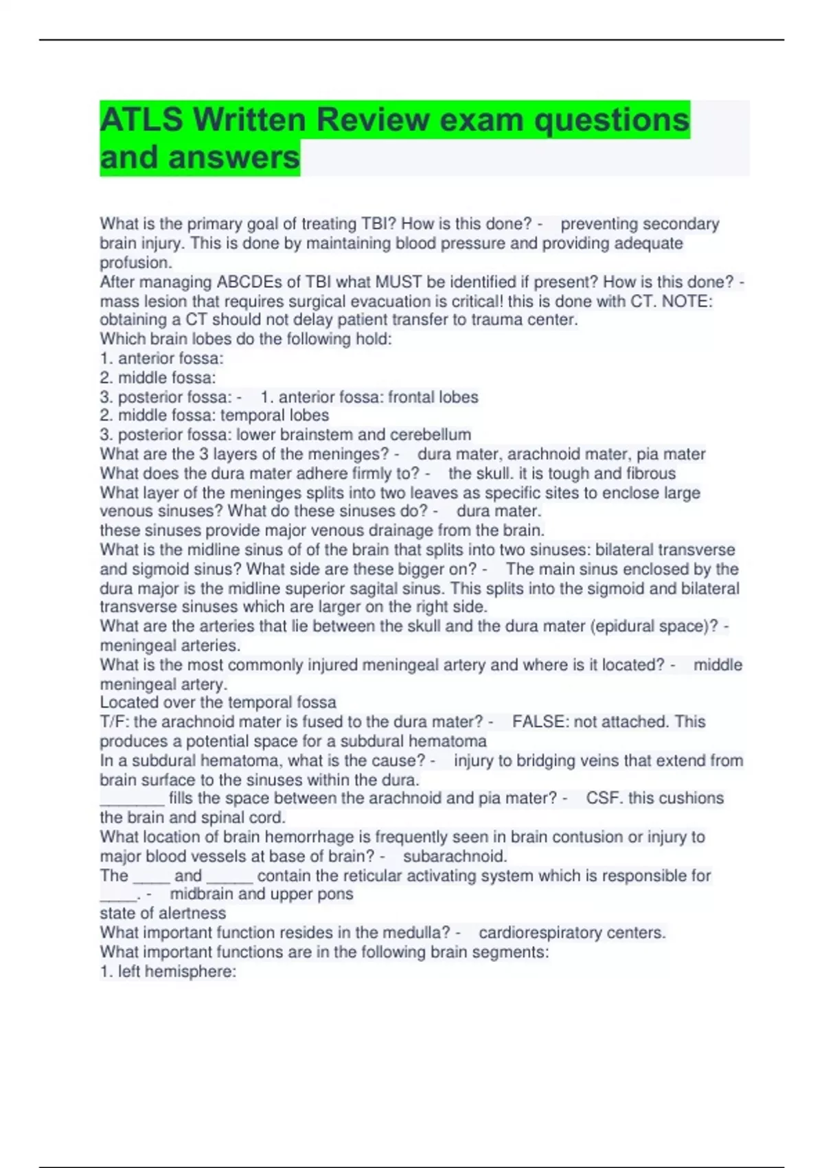 ATLS Written Review exam questions and answers What is the primary goal of treating TBI? How is this done? - preventing secondary brain injury. This is done by maintaining blood pressure and providing adequate profusion. After managing ABCDEs of TBI what MUST be identified if present? How is this done? - mass lesion that requires surgical evacuation is critical! this is done with CT. NOTE: obtaining a CT should not delay patient transfer to trauma center. Which brain lobes do the following hold: 1. anterior fossa: 2. middle fossa: 3. posterior fossa: - 1. anterior fossa: frontal lobes 2. middle fossa: temporal lobes 3. posterior fossa: lower brainstem and cerebellum What are the 3 layers of the meninges? - dura mater, arachnoid mater, pia mater What does the dura mater adhere firmly to? - the skull. it is tough and fibrous What layer of the meninges splits into two leaves as specific sites to enclose large venous sinuses? What do these sinuses do? - dura mater. these sinuses provide major venous drainage from the brain. What is the midline sinus of of the brain that splits into two sinuses: bilateral transverse and sigmoid sinus? What side are these bigger on? - The main sinus enclosed by the dura major is the midline superior sagital sinus. This splits into the sigmoid and bilateral transverse sinuses which are larger on the right side. What are the arteries that lie between the skull and the dura mater (epidural space)? - meningeal arteries. What is the most commonly injured meningeal artery and where is it located? - middle meningea