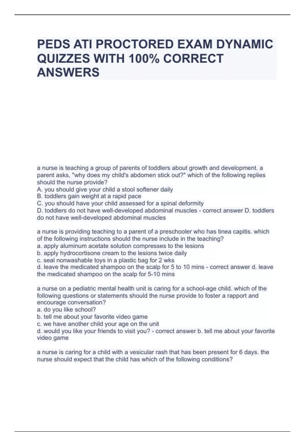 PEDS ATI PROCTORED EXAM DYNAMIC QUIZZES WITH 100% CORRECT ANSWERS a nurse is teaching a group of parents of toddlers about growth and development. a parent asks, "why does my child's abdomen stick out?" which of the following replies should the nurse provide? A. you should give your child a stool softener daily B. toddlers gain weight at a rapid pace C. you should have your child assessed for a spinal deformity D. toddlers do not have well-developed abdominal muscles - correct answer D. toddlers do not have well-developed abdominal muscles a nurse is providing teaching to a parent of a preschooler who has tinea capitis. which of the following instructions should the nurse include in the teaching? a. apply aluminum acetate solution compresses to the lesions b. apply hydrocortisone cream to the lesions twice daily c. seal nonwashable toys in a plastic bag for 2 wks d. leave the medicated shampoo on the scalp for 5 to 10 mins - correct answer d. leave the medicated shampoo on the scalp for 5-10 mins a nurse on a pediatric mental health unit is caring for a school-age child. which of the following questions or statements should the nurse provide to foster a rapport and encourage conversation? a. do you like school? b. tell me about your favorite video game c. we have another child your age on the unit d. would you like your friends to visit you? - correct answer b. tell me about your favorite video game a nurse is caring for a child with a vesicular rash that has been present for 6 days. the nurse should expect that the child has which of the following conditions? a. measles b. fifth disease c. tetanus d. varicella - correct answer varicella a nurse is caring for a 6 week old infant following a pyloromyotomy. which of the following forms of feeding should the nurse anticipate for the infant 6 hr after the procedure? a. bottle formula with added protein b. small, frequent bottle feedings of electrolyte solution c. continuous nasoduodenal tube feedings d. bolus feedings via gastrostomy tube - correct answer small, frequent bottle feedings of electrolyte solution will resume 24 hrs after pyloromyotomy surgery if small, frequent feedings of electrolyte solution are retained by the infant - correct answer small, incremental formula feedings nasoduodenal tube feedings are indicated for children who - correct answer have brain injuries or are on mechanical ventilation gastrostomy feedings are indicated for children who - correct answer cannot have foods or fluid by mouth or for whom the passage of a tube through the esophagus is contraindicated a nurse is providing teaching to the guardian of a child who has kawaski disease. which of the following statements by the guardian indicates an understanding of the teaching? select all that apply a. my child will likely be irritable for the next few weeks b. i will notify my child's doctor if the skin on her hands or feet begins to peel c. i will ensure my child does not receive any live vaccines for at least 18 months d. i will keep a record of my child's temp until she has no fever for several days e. my child will have joint stiffness primarily at the end of the day - correct answer -my child will likely be irritable for the next few weeks -i will ensure my child does not receive any live vaccines for at least 18 months -i will keep a record of my child's temp until she has no fever for several days a child who is diagnosed with kawaski disease will likely be - correct answer irritable for up to 2 months a child who has kawaski disease receives high doses of gamma globulin during the initial phase, which might result in - correct answer the inability to produce adequate antibodies in response to a live vaccine; therefore, these vaccines should be delayed for 11 months should be recorded in a child who has kawasaki disease - correct answer temperature until she has been afebrile for several days expected for a child who has kawaski disease - correct answer peeling of the skin of the hands and feet -peeling does not cause any pain and usually occurs between the second and third week -there is no need to report this manifestation to the child's provider a child who has kawasaki disease will likely have sx - correct answer joint stiffness and arthritis-related sx for several weeks -the joint stiffness is typically worse during cold weather and in the morning a nurse is caring for a toddler who has otitis media and a temp of 39.1 C (102.4 F). which of the following actions should the nurse take first> a. reduce the temp of the childs room b. redress the child in minimal clothing c. apply cool compresses to the childs forehead d. administer an antipyretic to the child - correct answer administer an antipyretic to the child a nurse is assessing a 3 y/o child during a well-child exam. which of the following findings should the nurse report to the provider? a. the child wets the bed when sleeping b. the child cannot catch a ball c. the child cannot walk on tiptoe d. the child builds a tower of 10 cibes - correct answer the child cannot walk on tiptoe a child should be able to take a few steps on tiptoe by - correct answer 30 months of age bedwetting during sleep is an expected finding for a - correct answer 3 y/o the ability to catch a ball occurs when a child is - correct answer 4-5 y/o building a tower of 10 cubes is an expected finding for a - correct answer 3 y/o child a nurse is caring for a newborn who has spina bifida. the newborns parents are upset by the dx. which of the following actions should the nurse take? a. discuss placement options for the newborn b. encourage the parents to touch and care for the newborn c. reassure the parents that everything will be fine d. avoid talking about the newborns defect until the parents bring up the subject - correct answer encourage the parents to touch and care for the newborn a nurse is teaching the parent of an infant about injury prevention. which of the following statements by the parent indicates an understa