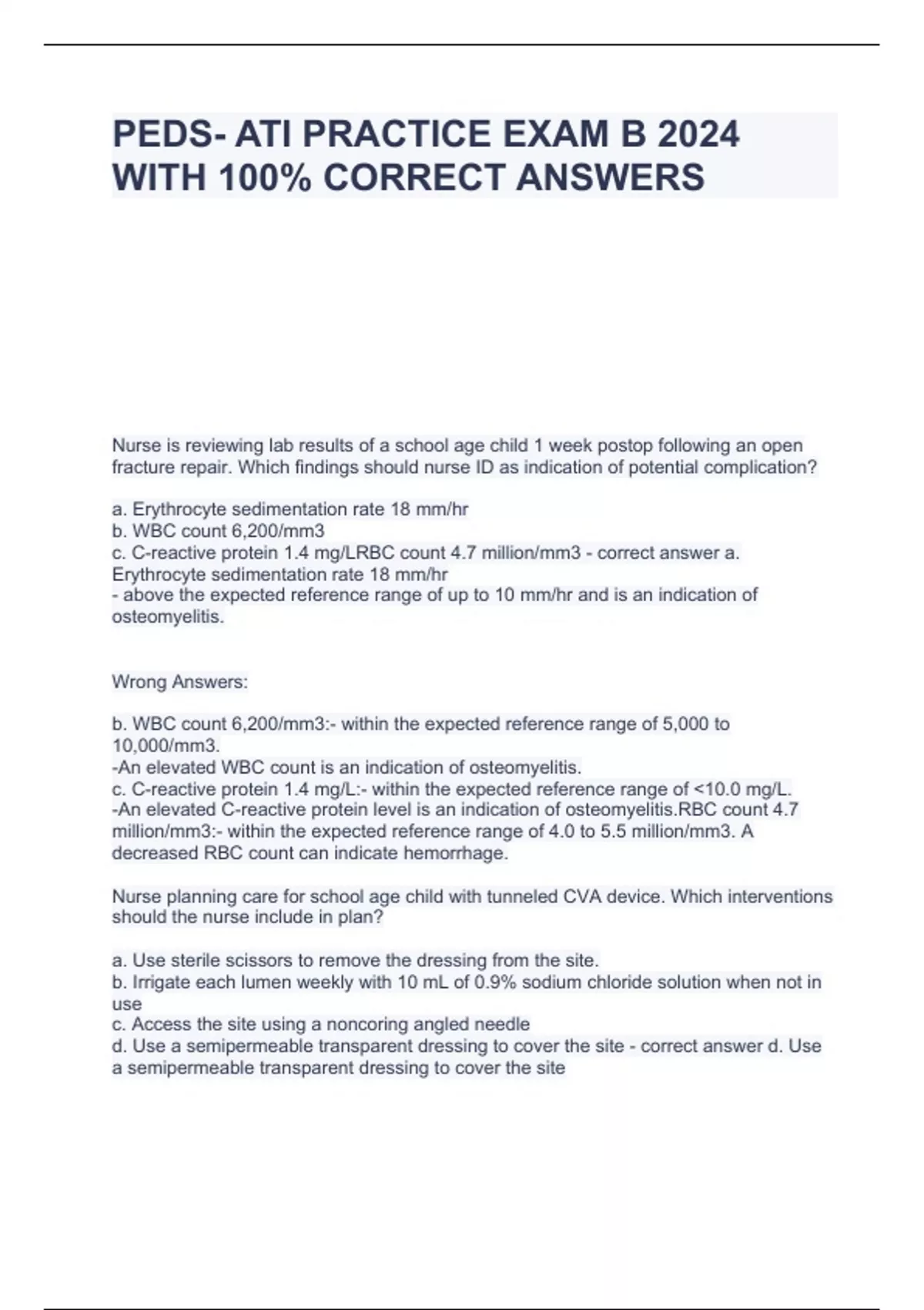 PEDS- ATI PRACTICE EXAM B 2024 WITH 100% CORRECT ANSWERS Nurse is reviewing lab results of a school age child 1 week postop following an open fracture repair. Which findings should nurse ID as indication of potential complication? a. Erythrocyte sedimentation rate 18 mm/hr b. WBC count 6,200/mm3 c. C-reactive protein 1.4 mg/LRBC count 4.7 million/mm3 - correct answer a. Erythrocyte sedimentation rate 18 mm/hr - above the expected reference range of up to 10 mm/hr and is an indication of osteomyelitis. Wrong Answers: b. WBC count 6,200/mm3:- within the expected reference range of 5,000 to 10,000/mm3. -An elevated WBC count is an indication of osteomyelitis. c. C-reactive protein 1.4 mg/L:- within the expected reference range of <10.0 mg/L. -An elevated C-reactive protein level is an indication of osteomyelitis.RBC count 4.7 million/mm3:- within the expected reference range of 4.0 to 5.5 million/mm3. A decreased RBC count can indicate hemorrhage. Nurse planning care for school age child with tunneled CVA device. Which interventions should the nurse include in plan? a. Use sterile scissors to remove the dressing from the site. b. Irrigate each lumen weekly with 10 mL of 0.9% sodium chloride solution when not in use c. Access the site using a noncoring angled needle d. Use a semipermeable transparent dressing to cover the site - correct answer d. Use a semipermeable transparent dressing to cover the site - The nurse should cover the site with a semipermeable transparent dressing to reduce the risk of infection. Wrong Answers: a. Use sterile scissors to remove the dressing from the site - The nurse should avoid the use of scissors when performing dressing changes because this can result in accidental cutting of the catheter. b. Irrigate each lumen weekly with 10 mL of 0.9% sodium chloride solution when not in use - The nurse should flush each lumen of the catheter with a heparin solution daily when not in use. c. Access the site using a noncoring angled needle - The nurse should use a noncoring angled or straight needle when accessing an implanted port. Nurse is planning care to address nutritional needs for preschooler with cystic fibrosis. Which interventions should the nurse include in plans? a. Administer pancreatic enzymes 2 hr after meals. b. Discontinue the use of pancreatic enzymes if steatorrhea develops. c. Limit fluid intake to 750 mL per day. d. Increase fat content in the child's diet to 40% of total calories. - correct answer d. Increase fat content in the child's diet to 40% of total calories - A child who has cystic fibrosis is unable to properly digest fats due to fibrosis of the pancreas and limited secretion of pancreatic enzymes. The nurse should increase the child's fat intake to 35% to 40% of total caloric intake. Wrong Answers: a. Administer pancreatic enzymes 2 hr after meals - The nurse should plan to administer pancreatic enzymes within 30 min of meals and snacks to replace the enzymes lost with cystic fibrosis. b. Discontinue the use of pancreatic enzymes if steatorrhea develops - A child who has cystic fibrosis and develops steatorrhea, or fatty stools, might need to have their dosage of pancreatic enzyme increased by their provider until the steatorrhea resolves. c. Limit fluid intake to 750 mL per day - The nurse should encourage fluid intake, rather than restrict it, to prevent dehydration caused by the loss of sodium and chloride through perspiration. Nurse in ED auscultates lungs of adolescent experiencing dyspnea. Nurse should ID sound as what? a. Wheezes b. Crackles c. Pleural friction rub d. Rhonchi - correct answer a. Wheezes - high-pitched, musical or whistling-like sounds heard primarily on expiration as air passes through and vibrates narrowed airways. Wrong answers: b. Crackles - high-pitched, short, and noncontinuous sounds usually heard at the end of inspiration. Crackles occur when air expands deflated alveoli or when the passage of air through small airways is disrupted. c. Pleural friction rub - a loud, rough, grating sound that can be heard during inspiration or expiration. A pleural friction rub occurs when the pleurae are inflamed and the surfaces rub together. d. Rhonchi - low-pitched, continuous sounds that have a snore-like quality and are usually louder during expiration. Rhonchi occur when the larger airways are obstructed. Nurse assesses school age child with infratentorial brain tumor. Which findings should the nurse ID as manifestation of IICP? a. Hypotension b. Reports insomnia c. Difficulty concentrating d. Tachycardia - correct answer c. Difficulty concentrating - The nurse should identify that irritability, inability to follow commands, and difficulty concentrating are manifestations of IICP due to decreased blood flow within the brain and pressure on the brainstem. Wrong Answers: a. Hypotension - HTN is a late manifestation of IICP due to compression of the brain vessels. b. Reports insomnia - somnolence and lethargy are manifestations of IICP. c. Tachycardia - bradycardia is a late manifestation of IICP. Nurse assesses infant with pneumonia. Which findings is priority for nurse to report to HCP? a. Nasal flaring b. WBC count 11,300/mm3 c. Diarrhea d. Abdominal distension - correct answer a. Nasal flaring - When using the ABC approach to client care, the nurse should determine that the priority finding to report to the provider is nasal flaring. Nasal flaring indicates the infant is experiencing acute respiratory distress. Wrong Answers: b. WBC count 11,300/mm3 - The nurse should report a WBC count of 11,300/mm3 because it is above the expected reference range of 5,000 to 10,000/mm3 and indicates infection. However, there is another finding that is the priority for the nurse to report. c. Diarrhea - The nurse should report diarrhea because it is a manifestation of pneumonia in infants and indicates the current treatment is not effective. However, there is another finding that is the priority for the nurse to report. d. Abdominal di