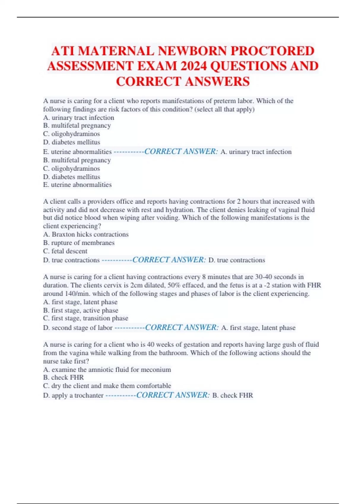 ATI MATERNAL NEWBORN PROCTORED ASSESSMENT EXAM 2024 QUESTIONS AND CORRECT ANSWERS