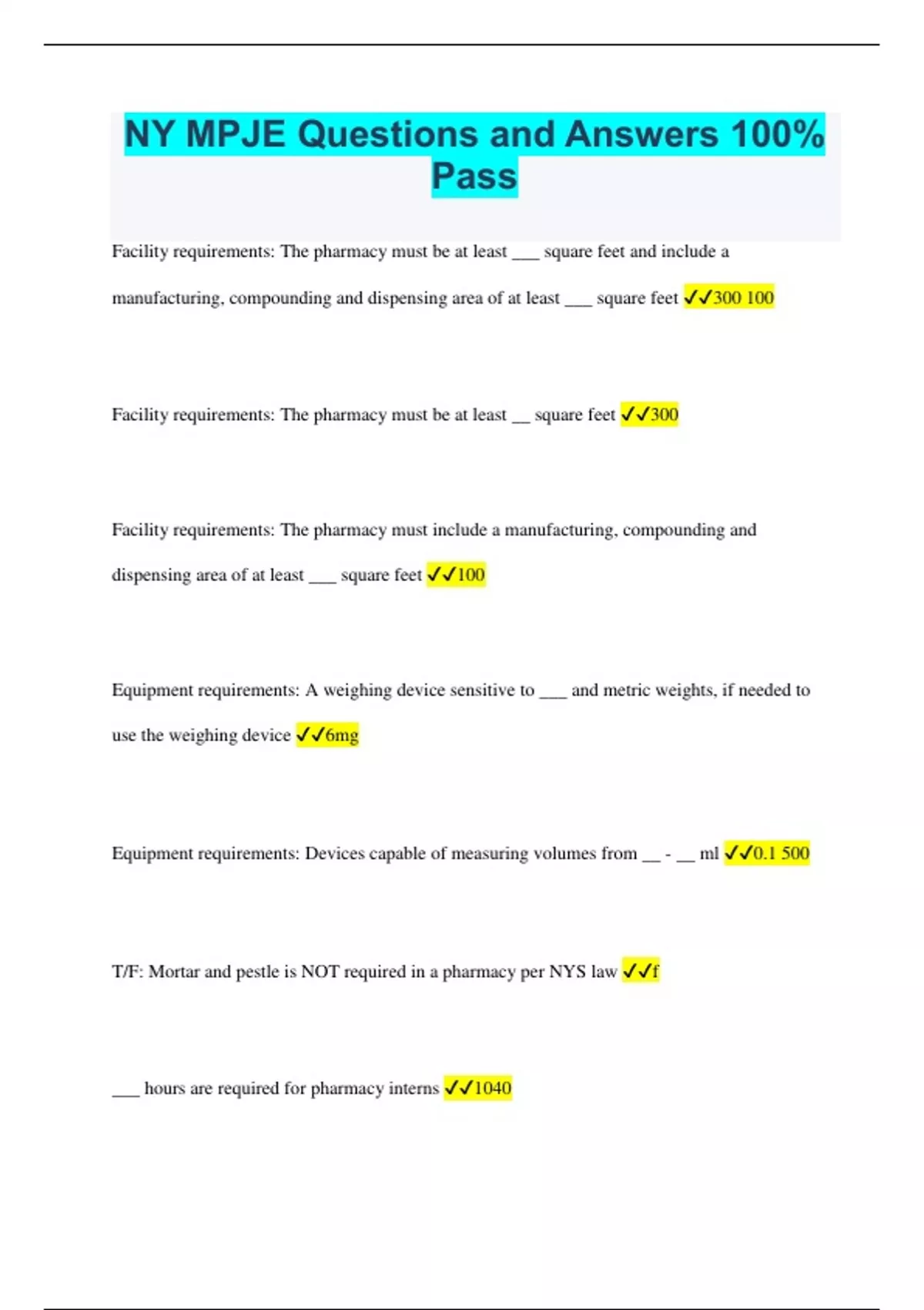 NY MPJE Questions and Answers 100% Pass Facility requirements: The pharmacy must be at least ___ square feet and include a manufacturing, compounding and dispensing area of at least ___ square feet 300 100 Facility requirements: The pharmacy must be at least __ square feet 300 Facility requirements: The pharmacy must include a manufacturing, compounding and dispensing area of at least ___ square feet 100 Equipment requirements: A weighing device sensitive to ___ and metric weights, if needed to use the weighing device 6mg Equipment requirements: Devices capable of measuring volumes from __ - __ ml 0.1 500 T/F: Mortar and pestle is NOT required in a pharmacy per NYS law f ___ hours are required for pharmacy interns 1040 ___ hours of didactic instruction is required to become a nuclear pharmacist? (non board certified) 200 ___ members of the NYS BOP 13 Members of the NYS BOP serve for ___ years 5 ___ Pharmacists are required to be on the NYS BOP 9 ___ registered technicians on the NYS BOP 2 ___ Public members on the NYS BOP 2 ___ non-pharmacist members of the NYS BOP 4 Intern permit can be extended up to ___ years 2 ___ full time intern per pharmacist 1 ___ part time intern per pharmacist 2 T/F: Mail order pharmacies are required to have their hours listed on labels f T/F: Mail order pharmacies are required to have a phone number listed on labels t Manufacturers should notify FDA ____ days before withdrawal of a drug from the market 180 Schedule II drugs and ____ shall not be refilled per NYS law bzd CS Prescriptions are limited to a ___ day supply in NYS 30 If there is a coded indication, the prescriber can write up to a ___ month supply of a CII substance 3 Code: Panic disorder a Code: ADHD b Code: chronic debilitating neurological conditions characterized as a movement disorder or exhibiting seizure, convulsive or spasm activity c Code: relief of pain in patients suffering from conditions or diseases known to be chronic or incurable d Code: Narcolepsy e Code: hormone deficiency states in males, gynecologic conditions that are responsive to treatment with anabolic steroids or chorionic gonadotropin, metastatic breast cancer in women, anemia and angioedema f Which Codes allow up to a 3 month supply of CI
