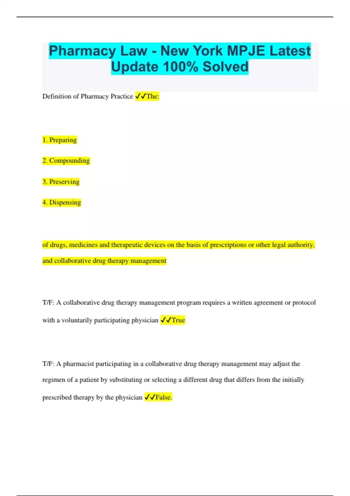 Pharmacy Law - New York MPJE Latest Update 100% Solved Definition of Pharmacy Practice The: 1. Preparing 2. Compounding 3. Preserving 4. Dispensing of drugs, medicines and therapeutic devices on the basis of prescriptions or other legal authority, and collaborative drug therapy management T/F: A collaborative drug therapy management program requires a written agreement or protocol with a voluntarily participating physician True T/F: A pharmacist participating in a collaborative drug therapy management may adjust the regimen of a patient by substituting or selecting a different drug that differs from the initially prescribed therapy by the physician False. A pharmacist can adjust drug strength, frequency, or route of administration. However, the pharmacist can't select a different drug unless it is expressly authorized in the written order or protocol What is the federal age requirement for a professional license? 19 T/F: Every pharmacist on duty should be identified by a badge designed by the state board of pharmacy which shall contain name and title True Requirements for Prescription Labels 1. Name and address of the owner of the establishment 2. Date compounded 3. Number of the prescription 4. Name of the prescriber 5. Name and address of the patient 6. Directions for use T/F: Pharmacies who deliver medication w/o patient or authorized consent are required to accept the return of the medication from the patient, refund the patient, and destroy the drug True When a Pharmacist receives an oral authorization for refills, what must be written on the reverse side of the original prescription? Date, time, and name of the practitioner authorizing the refill How long must records of all prescriptions filled or refilled be maintained by the pharmacy? 5 years T/F: It is mandatory to have the prescriber's signature (or electronic signature) on the prescription to validate the prescription? True What is written on every prescription in the state under the signature line? "This prescription will be filled generically unless prescriber writes DAW in the box below" T/F: Every prescription written in the state by a person authorized to issue a prescription should imprint or stamp a legible copy of the prescriber's name in ADDITION to their signature True Requirements of an Auction 1. The PLACE of auction must be registered w/the Board and under a licensed pharmacist supervision. 2. Drugs in open containers connot be sold at auction unless there is a certificate from the Board that shows the drugs were inspected. 3. Drugs may not be sold at auction after expiration or if expiration date is within 30 days or less from date of sale 4. Board of pharmacy must be notified at least 7 days prior to the date of the auction w/Date, time, and place 5. Drugs in bulk or open containers may be sold in 1 lot only Composition of Board of Pharmacy 1. At least 9 pharmacists, each licensed in the state for at least 5 years 2. Minimum of 2 public representatives Positions last for 5 year terms Child-Resistant Containers (Poison Prevention Packaging Act) Considered unprofessional conduct not to package a drug in child-resistant container, unless the PRESCRIBER or PATIENT requests otherwise. Purpose of the Poison Prevention Packaging To prevent/minimize risk of serious personal injury or serious illness to children under 5 years of age by hazardous household substances (including Rx drugs) What must a Refill of a C3 - C5 Controlled substance must have on the reverse side? 1. Date dispensed 2. Amount dispensed 3. Signature of dispensing pharmacist T/F: All employees can enter controlled substance information into computer record keeping False. Employees can type/key in information, but only pharmacists or pharmacy interns can enter the information T/F: It is mandatory for prescribers to use electronic prescribing True When is a prescriber exempt from electronic prescribing? 1. Veterinarian 2. Rx will be dispensed in a pharmacy outside of New York 3. Impractical for a patient to obtain substances in a timely manner if sent electronically 4. Prescriber has a waiver from the NYS Commissioner of Health 5. E-prescribing is not available due to temporary technological/electronic failure T/F: Emails and faxes are considered e-prescribing False T/F: Electronic prescriptions require an NPI, electronic signature, and specify DAW or not True How often do computer applications require renewal through the Bureau of Narcotic Enforcement (BNE)? Every 2 years How many continuing education hours are necessary Minimum of 45 contact hours in each 3-year period (w/at least 23 live hours) T/F: Pharmacists must keep their own continuing education records for 6 years from program date for random audits True. Must have: 1. Title of course (any ID# assigned) 2. # hours completed 3. sponsor's name 4. Verification on your attendance by the sponsor 5. Date and location Who has jurisdiction over controlled substances in NYS? Department of Health (DOH) What is the form used to order C2 prescriptions? DEA 222 Form T/F: Pre-printed prescriptions are allowed in NYS? False. Use of pre-printed prescriptions is prohibited How long must records of controlled substances be kept? 5 years T/F: Hydrocodone and anabolic steroids are considered C3 medications federally and don't require DEA 222 Form True. T/F: Benzodiazepines are C4 drugs that have similar C2 limitations in NYS True. They may have no refills, dispensing is limited to 30 day supply, and emergency Rx is limited to 5 day supplies Condition or prescription code must be written on the face of a controlled substance prescription True. Codes: A - Panic Disorder B - Minimal brain function, ADHD C - Chronic debilitating neurological conditions D - Relief of pain in patients suffering from diseases known to be chronic and incurable E - Narcolepsy F - Hormone Deficiency T/F: When a prescription for a C3 - C5 with a code is written for a quantity in excess of 30 day supply, the prescription can only be refilled