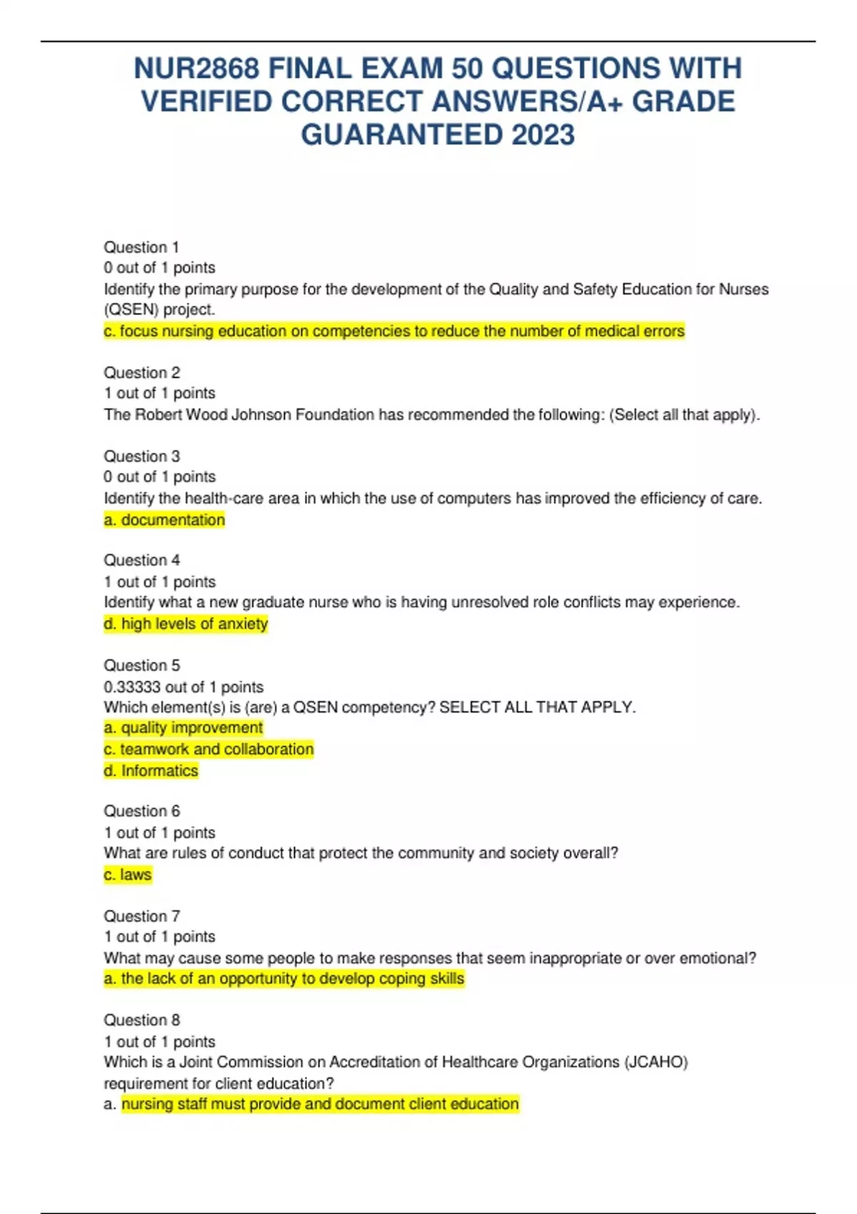 NUR2868 FINAL EXAM 50 QUESTIONS WITH VERIFIED CORRECT ANSWERS/A+ GRADE GUARANTEED 2023 Question 1 0 out of 1 points Identify the primary purpose for the development of the Quality and Safety Education for Nurses (QSEN) project. c. focus nursing education on competencies to reduce the number of medical errors Question 2 1 out of 1 points The Robert Wood Johnson Foundation has recommended the following: (Select all that apply). Question 3 0 out of 1 points Identify the health-care area in which the use of computers has improved the efficiency of care. a. documentation Question 4 1 out of 1 points Identify what a new graduate nurse who is having unresolved role conflicts may experience. d. high levels of anxiety Question 5 0.33333 out of 1 points Which element(s) is (are) a QSEN competency? SELECT ALL THAT APPLY. a. quality improvement c. teamwork and collaboration d. Informatics Question 6 1 out of 1 points What are rules of conduct that protect the community and society overall? c. laws Question 7 1 out of 1 points What may cause some people to make responses that seem inappropriate or over emotional? a. the lack of an opportunity to develop coping skills Question 8 1 out of 1 points Which is a Joint Commission on Accreditation of Healthcare Organizations (JCAHO) requirement for client education? a. nursing staff must provide and document client education