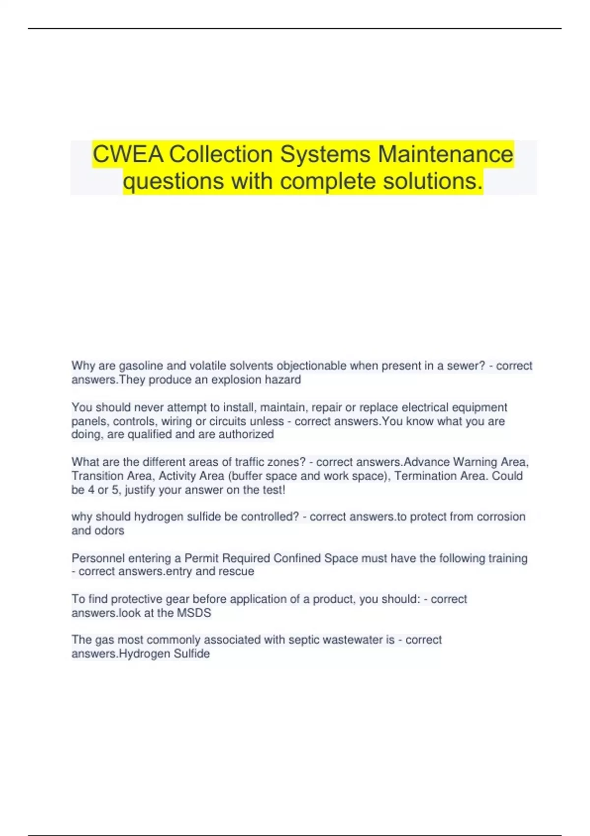 CWEA Collection Systems Maintenance questions with complete solutions. Why are gasoline and volatile solvents objectionable when present in a sewer? - correct answers.They produce an explosion hazard You should never attempt to install, maintain, repair or replace electrical equipment panels, controls, wiring or circuits unless - correct answers.You know what you are doing, are qualified and are authorized What are the different areas of traffic zones? - correct answers.Advance Warning Area, Transition Area, Activity Area (buffer space and work space), Termination Area. Could be 4 or 5, justify your answer on the test! why should hydrogen sulfide be controlled? - correct protect from corrosion and odors Personnel entering a Permit Required Confined Space must have the following training - correct and rescue To find protective gear before application of a product, you should: - correct at the MSDS The gas most commonly associated with septic wastewater is - correct answers.Hydrogen Sulfide