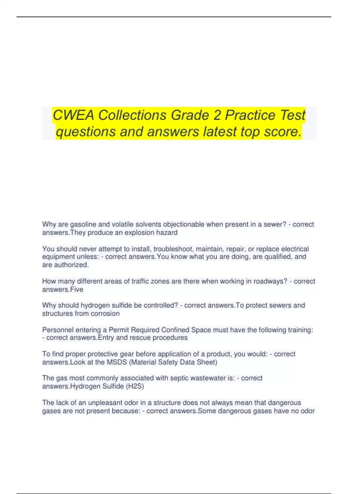 CWEA Collections Grade 2 Practice Test questions and answers latest top score. Why are gasoline and volatile solvents objectionable when present in a sewer? - correct answers.They produce an explosion hazard You should never attempt to install, troubleshoot, maintain, repair, or replace electrical equipment unless: - correct answers.You know what you are doing, are qualified, and are authorized. How many different areas of traffic zones are there when working in roadways? - correct answers.Five Why should hydrogen sulfide be controlled? - correct answers.To protect sewers and structures from corrosion Personnel entering a Permit Required Confined Space must have the following training: - correct answers.Entry and rescue procedures To find proper protective gear before application of a product, you would: - correct answers.Look at the MSDS (Material Safety Data Sheet) The gas most commonly associated with septic wastewater is: - correct answers.Hydrogen Sulfide (H2S) The lack of an unpleasant odor in a structure does not always mean that dangerous gases are not present because: - correct answers.Some dangerous gases have no odor What four conditions are necessary to create an explosion? - correct answers.Combustible gas, adequate oxygen, sufficient heat, and proper mixing of gas and oxygen. What does "transition area" mean in traffic control? - correct answers.Moves traffic out of its normal path The term "transition area" is one component of a: - correct answers.Traffic Control Zone What elements should be considered to improve worker safety in High Speed Temporary Traffic Control Zones? - correct answers.Rerouting traffic around the work site, positioning of law enforcement officers in the temporary traffic control zone, and work zone training. What key factors would you need to address when developing an S.O.P. for Lift Station failure? - correct answers.Traffic control plan, by-pass connections, and spill containment. "Spring Blades" are a type of tool used with: - correct answers.Power Rodder Porcupine, Root Saw, and a Square Bar Cork Screw are all tools used for: - correct answers.Sewer rodding What tool would you use to cut VCP pipe? - correct answers.Chain pipe cutter Which conditions should a gas detection device test for? - correct answers.Hydrogen Sulfide, explosive/flammable gases, oxygen. What does "LEL" mean on a gas detection meter? - correct answers.Lower explosive limit The oxygen level alarm in a gas detection meter is normally set to go off at oxygen levels below: - correct answers.19.5% When developing an S.O.P. for scheduled maintenance of electrical equipment, what program should be addressed as a primary safety guideline? - correct answers.The L.O.T.O. (Lock Out Tag Out) Program What document would you require to be referenced when developing an S.O.P. for hazardous substance spill cleanup as well as spill containment? - correct answers.M.S.D.S. Placement of the Blower and P.P.E. are two things you would include in developing an S.O.P. for air monitoring in a: - correct answers.Permit Required Confined Space