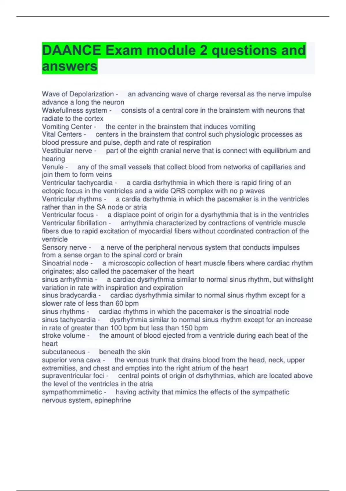 DAANCE Exam module 2 questions and answers Wave of Depolarization - an advancing wave of charge reversal as the nerve impulse advance a long the neuron Wakefullness system - consists of a central core in the brainstem with neurons that radiate to the cortex Vomiting Center - the center in the brainstem that induces vomiting Vital Centers - centers in the brainstem that control such physiologic processes as blood pressure and pulse, depth and rate of respiration Vestibular nerve - part of the eighth cranial nerve that is connect with equilibrium and hearing Venule - any of the small vessels that collect blood from networks of capillaries and join them to form veins Ventricular tachycardia - a cardia dsrhythmia in which there is rapid firing of an ectopic focus in the ventricles and a wide QRS complex with no p waves Ventricular rhythms - a cardia dsrhythmia in which the pacemaker is in the ventricles rather than in the SA node or atria Ventricular focus - a displace point of origin for a dysrhythmia that is in the ventricles Ventricular fibrillation - arrhythmia characterized by contractions of ventricle muscle fibers due to rapid excitation of myocardial fibers without coordinated contraction of the ventricle Sensory nerve - a nerve of the peripheral nervous system that conducts impulses from a sense organ to the spinal cord or brain Sinoatrial node - a microscopic collection of heart muscle fibers where cardiac rhythm originates; also called the pacemaker of the heart sinus arrhythmia - a cardiac dysrhythmia similar to normal sinus rhythm, but withslight variation in rate with inspiration and expiration sinus bra
