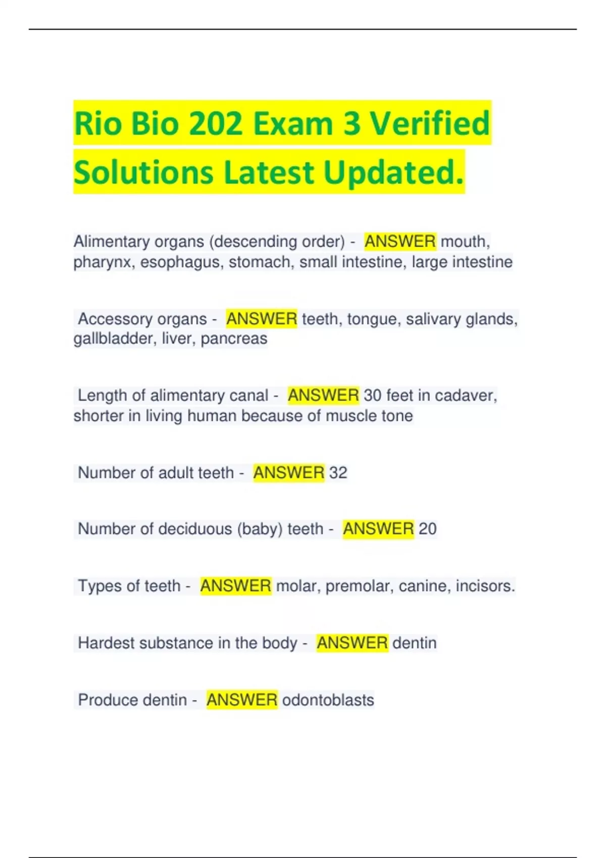 Rio Bio 202 Exam 3 Verified Solutions Latest Updated. Alimentary organs (descending order) - ANSWER mouth, pharynx, esophagus, stomach, small intestine, large intestine Accessory organs - ANSWER teeth, tongue, salivary glands, gallbladder, liver, pancreas Length of alimentary canal - ANSWER 30 feet in cadaver, shorter in living human because of muscle tone Number of adult teeth - ANSWER 32 Number of deciduous (baby) teeth - ANSWER 20 Types of teeth - ANSWER molar, premolar, canine, incisors. Hardest substance in the body - ANSWER dentin Produce dentin - ANSWER odontoblasts Three types of salivary glands - ANSWER parotid glands, submandibular glands, sublingual glands Parotid gland secretion - ANSWER primarily serous fluid (salivary amylase) Submandibular gland secretion - ANSWER mix of mucin and serous fluid Sublingual gland secretion - ANSWER primarily mucin Mucin function - ANSWER bind and moisten food into a bolus Serous fluid/salivary amylase function - ANSWER starts digestion of starches Liver digestive function - ANSWER produces bile, which emulsifies fats in the duodenum Bile function - ANSWER emulsifies fats creating a larger surface area and allowing absorption Gallbladder function - ANSWER holds and releases bile into the digestive tract when fatty foods enter the duodenum. Jaundice - ANSWER yellowing of the body tissues due to bile in the blood stream Kupffer cells - ANSWER special phagocytic cells that line liver sinusoids and remove debris from blood. Hepatocytes - ANS