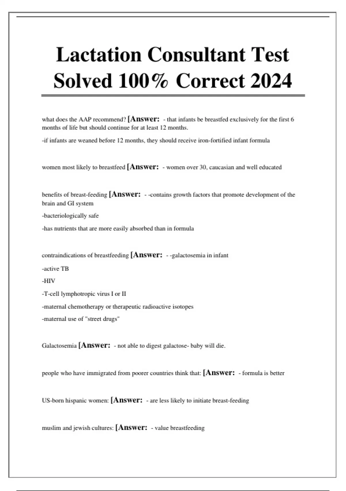 Lactation Consultant Test Solved 100% Correct 2024 what does the AAP recommend? [Answer: - that infants be breastfed exclusively for the first 6 months of life but should continue for at least 12 months. -if infants are weaned before 12 months, they should receive iron-fortified infant formula women most likely to breastfeed [Answer: - women over 30, caucasian and well educated benefits of breast-feeding [Answer: - -contains growth factors that promote development of the brain and GI system -bacteriologically safe -has nutrients that are more easily absorbed than in formula contraindications of breastfeeding [Answer: - -galactosemia in infant -active TB -HIV -T-cell lymphotropic virus I or II -maternal chemotherapy or therapeutic radioactive isotopes -maternal use of "street drugs" Galactosemia [Answer: - not able to digest galactose- baby will die.