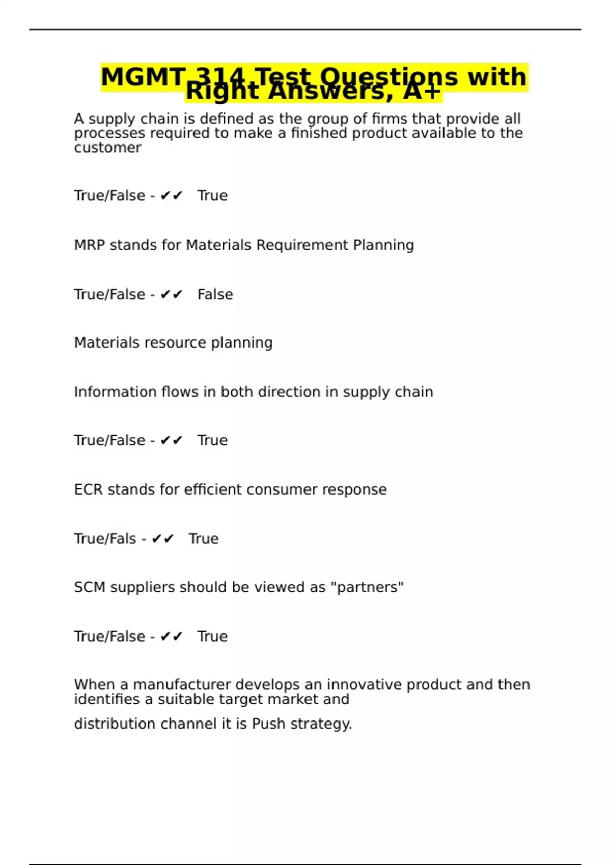 A supply chain is defined as the group of firms that provide all processes required to make a finished product available to the customer True/False - True MRP stands for Materials Requirement Planning True/False - False Materials resource planning Information flows in both direction in supply chain True/False - True ECR stands for efficient consumer response True/Fals - True SCM suppliers should be viewed as "partners" True/False - True When a manufacturer develops an innovative product and then identifies a suitable target market and distribution channel it is Push strategy. True/False - True Customers are not included as part of supply chains. True/False - False A company's supply chain involves the flow of materials and information from suppliers, through production, to the end users. True/False - True Supply chains are sometimes referred to as value chains because they reflect the concept that value is added as goods and services progress through the chain. True/False - True Relational exchanges cannot be successful without information sharing among various participants. True/False - True In supply chain organisations, functions must operate independently of each other. True/False - False A distributor makes investment decisions regarding the transportation infrastructure and then makes operating decisions to try to maximise the return from these assets. True/False - False Every business organisation is part of at least one supply chain True/False - True The vehicle-related cost is incurred whether the vehicle is operating or not and is considered fixed for short-term operational decisions by the carrier True/False - True Wal-Mart's EDI system issues electronic purchase orders and receives electronic invoices from virtually all of Wal-Mart's suppliers. True/False - True Upstream supply chain is involved with the procurement of material from suppliers. True/False - True A milk run is a route in which a truck either delivers product from a single supplier to multiple retailers or goes from multiple suppliers to a single retailer. True/False - True SCM can include having suppliers actually on site producing products or services in a manufacturers facility.