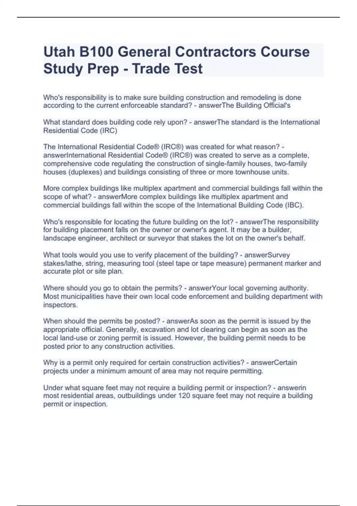 Utah B100 General Contractors Course Study Prep.Questions with solutions 2024