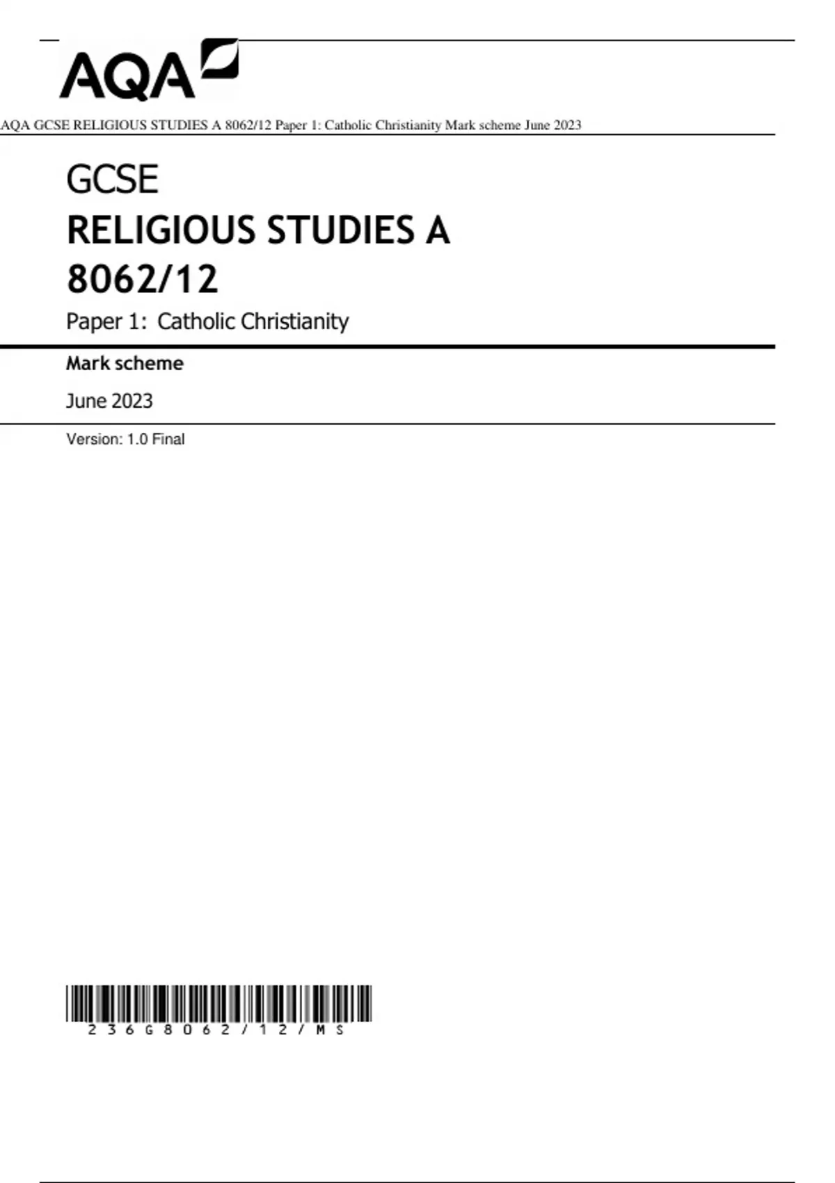 AQA GCSE RELIGIOUS STUDIES A 8062/12 Paper 1: Catholic Christianity Mark scheme June 2023