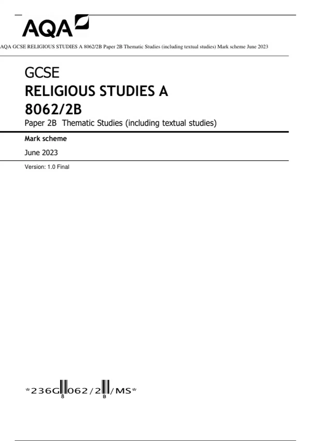 AQA GCSE RELIGIOUS STUDIES A 8062/2B Paper 2B Thematic Studies (including textual studies) Mark scheme June 2023