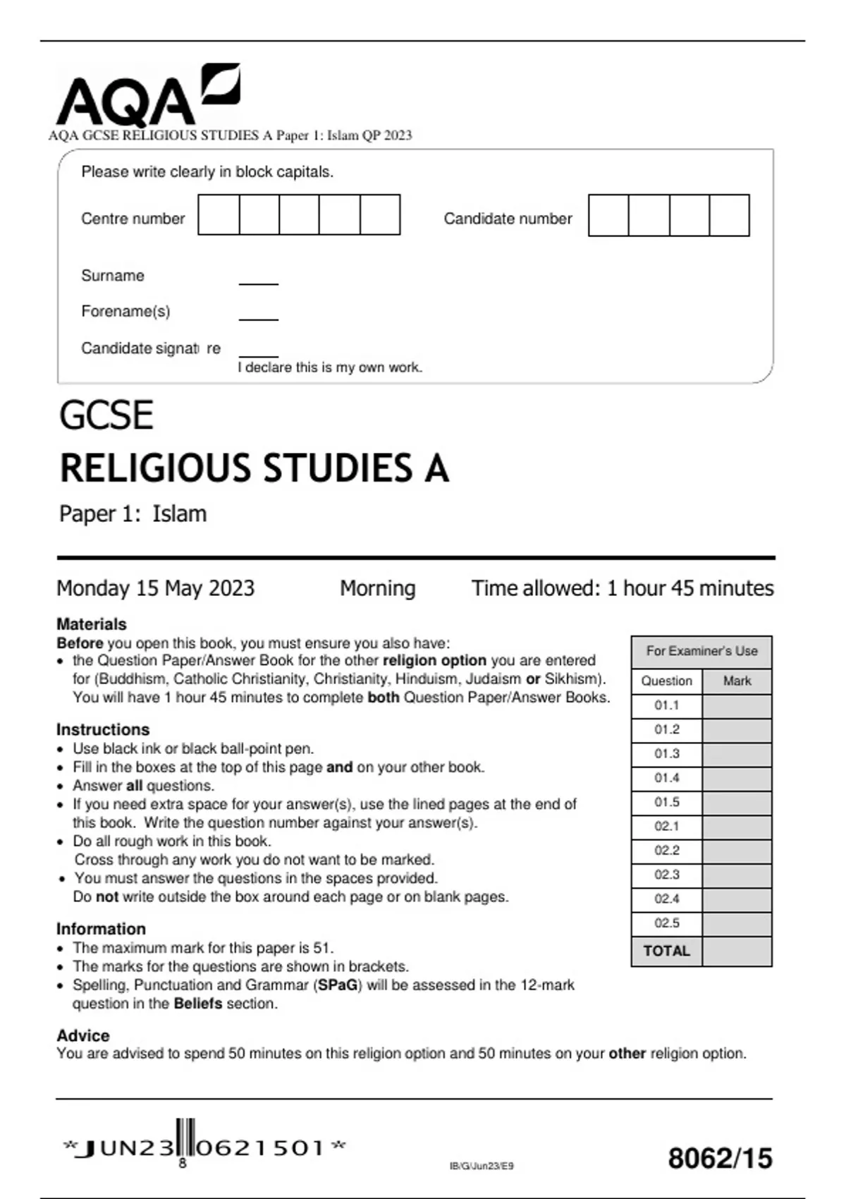 AQA GCSE RELIGIOUS STUDIES A Paper 1: Islam QP 2023