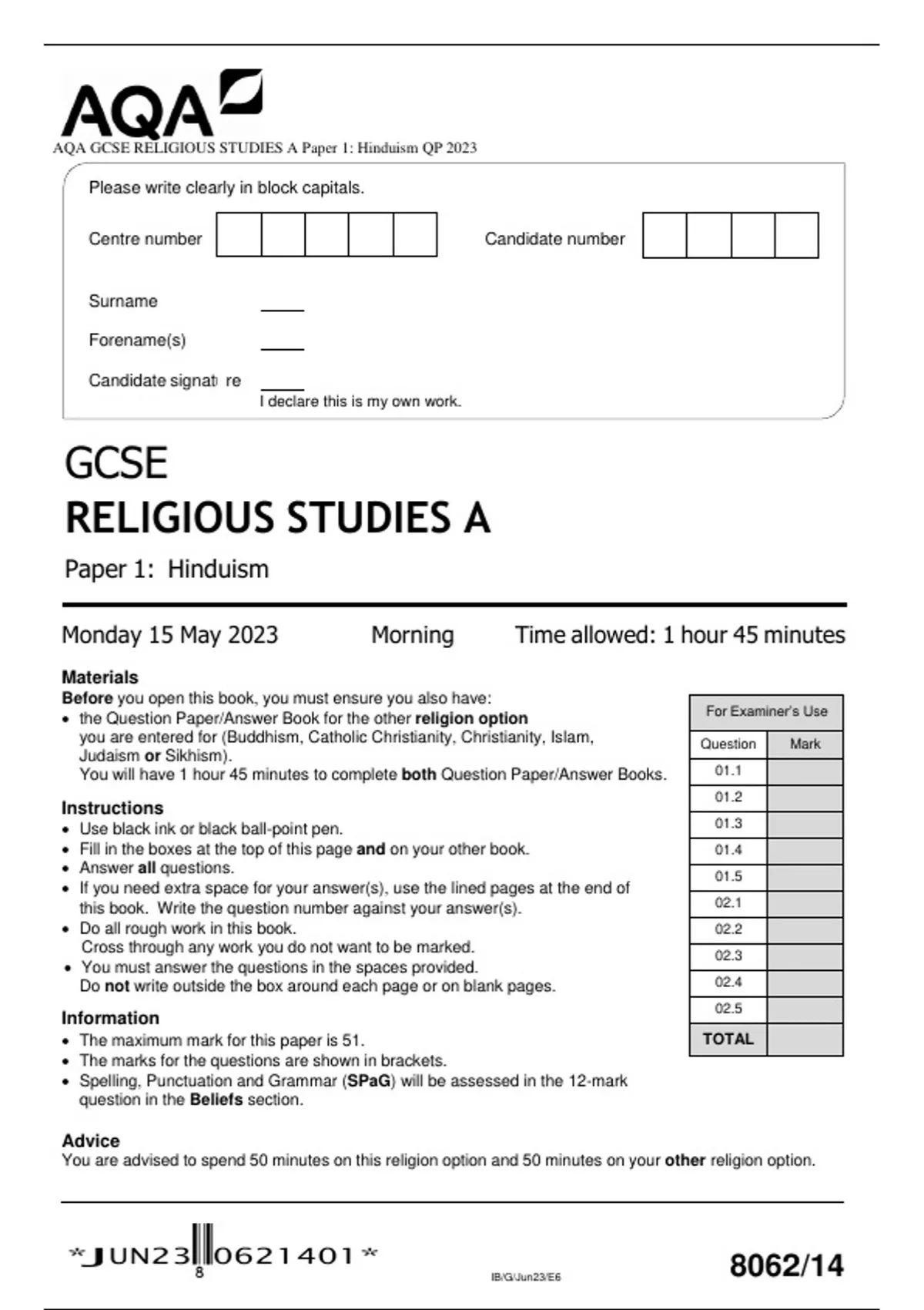 AQA GCSE RELIGIOUS STUDIES A Paper 1: Hinduism QP 2023
