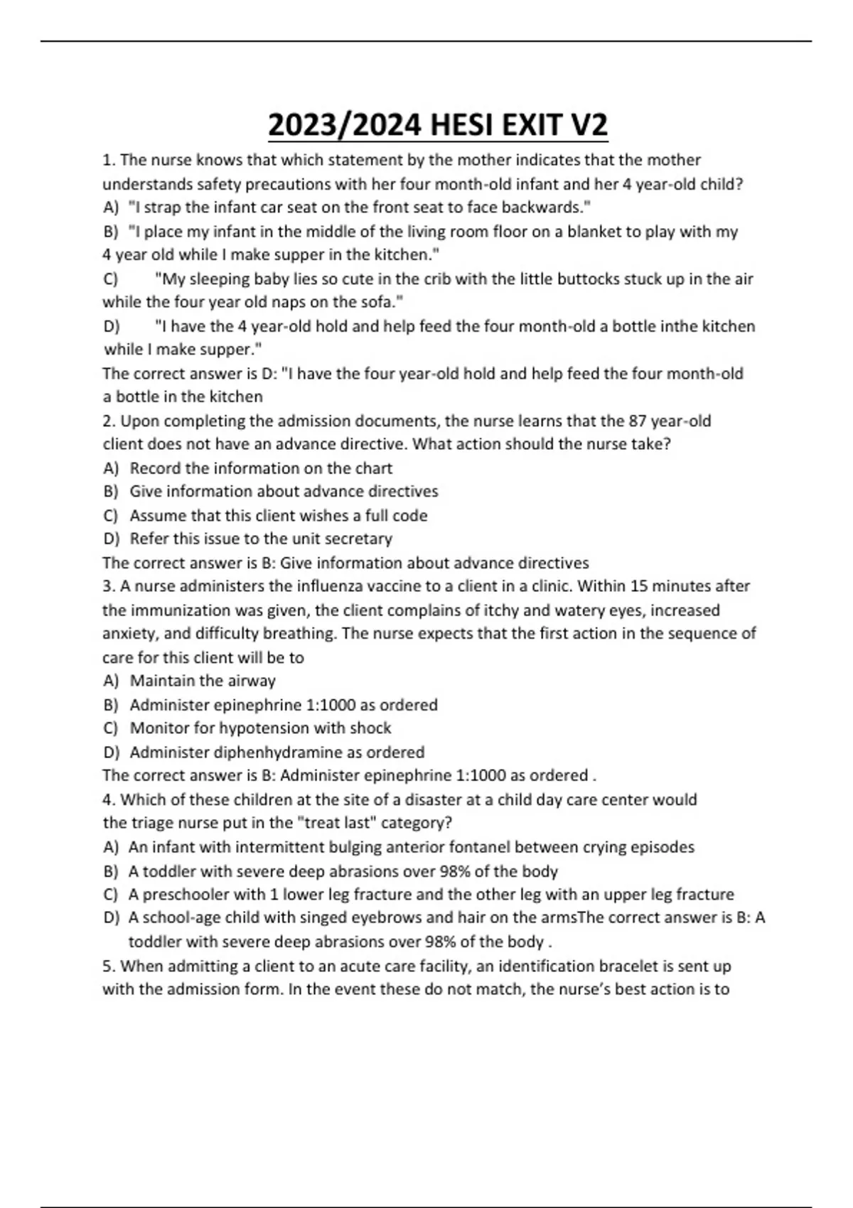 2023/2024 HESI EXIT V2 1. The nurse knows that which statement by the mother indicates that the mother understands safety precautions with her four month-old infant and her 4 year-old child? A) "I strap the infant car seat on the front seat to face backwards." B) "I place my infant in the middle of the living room floor on a blanket to play with my 4 year old while I make supper in the kitchen." C) "My sleeping baby lies so cute in the crib with the little buttocks stuck up in the air while the four year old naps on the sofa." D) "I have the 4 year-old hold and help feed the four month-old a bottle inthe kitchen while I make supper." The correct answer is D: "I have the four year-old hold and help feed the four month-old a bottle in the kitchen 2. Upon completing the admission documents, the nurse learns that the 87 year-old client does not have an advance directive. What action should the nurse take? A) Record the information on the chart B) Give information about advance directives C) Assume that this client wishes a full code D) Refer this issue to the unit secretary The correct answer is B: Give information about advance directives