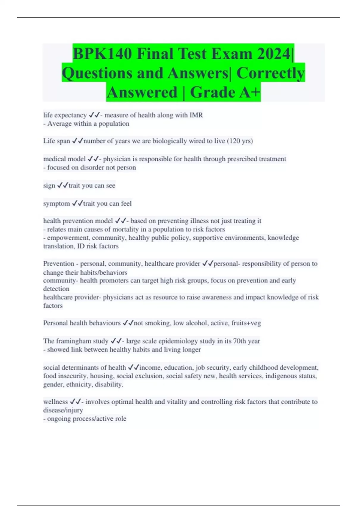 BPK140 Final Test Exam 2024| Questions and Answers| Correctly Answered | Grade A+ life expectancy - measure of health along with IMR - Average within a population Life span number of years we are biologically wired to live (120 yrs) medical model - physician is responsible for health through presrcibed treatment - focused on disorder not person sign trait you can see symptom trait you can feel health prevention model - based on preventing illness not just treating it - relates main causes of mortality in a population to risk factors - empowerment, community, healthy public policy, supportive environments, knowledge translation, ID risk factors Prevention - personal, community, healthcare provider personal- responsibility of person to change their habits/behaviors community- health promoters can target high risk groups, focus on prevention and early detection healthcare provider- physicians act as resource to raise awareness and impact knowledge of risk factors