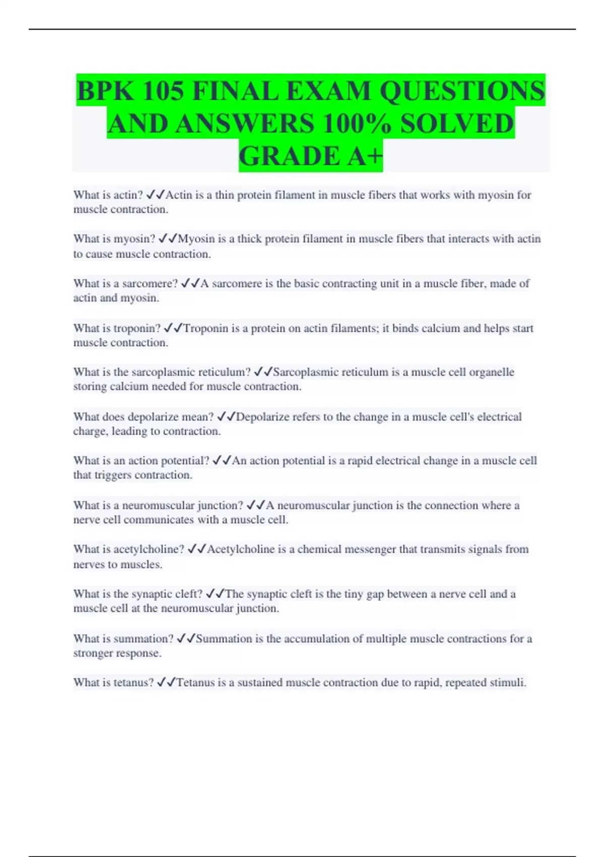 BPK 105 FINAL EXAM QUESTIONS AND ANSWERS 100% SOLVED GRADE A+ What is actin? Actin is a thin protein filament in muscle fibers that works with myosin for muscle contraction. What is myosin? Myosin is a thick protein filament in muscle fibers that interacts with actin to cause muscle contraction. What is a sarcomere? A sarcomere is the basic contracting unit in a muscle fiber, made of actin and myosin. What is troponin? Troponin is a protein on actin filaments; it binds calcium and helps start muscle contraction. What is the sarcoplasmic reticulum? Sarcoplasmic reticulum is a muscle cell organelle storing calcium needed for muscle contraction. What does depolarize mean? Depolarize refers to the change in a muscle cell's electrical charge, leading to contraction.