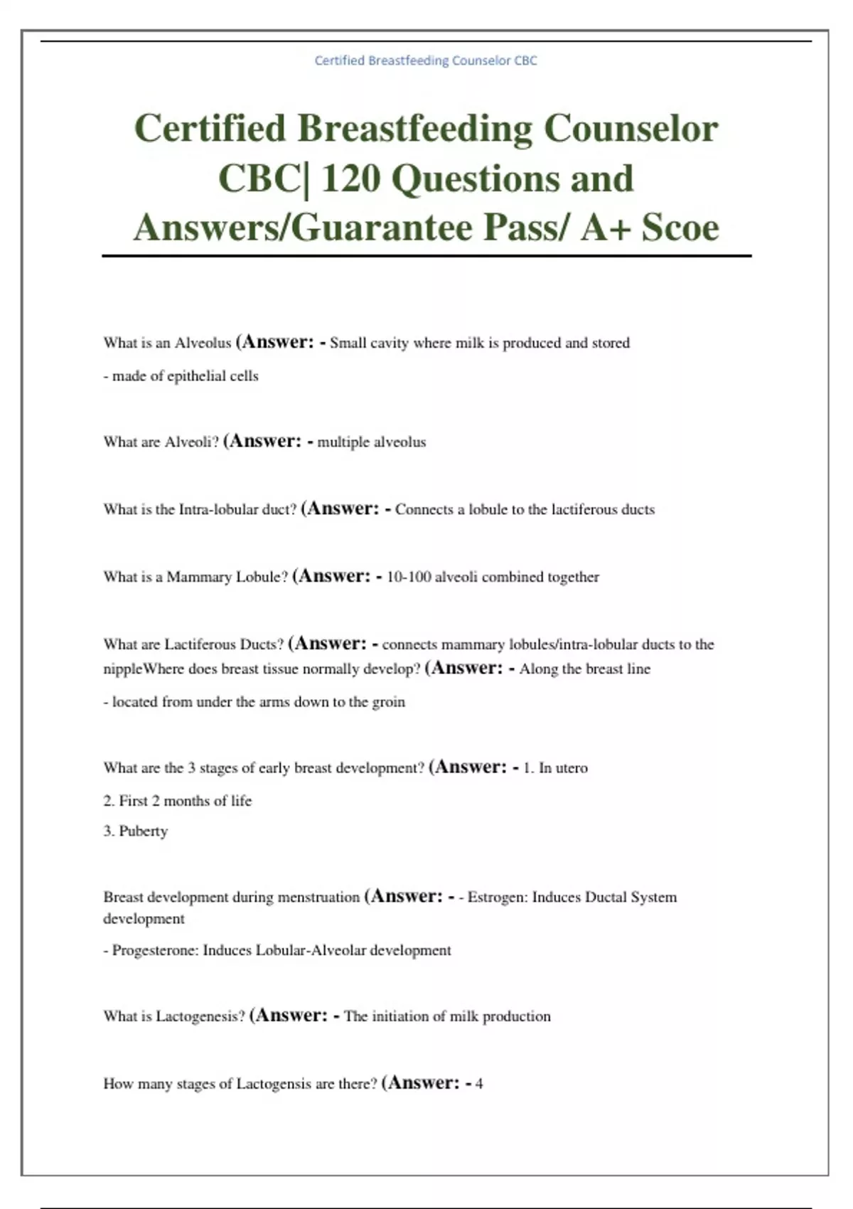 Certified Breastfeeding Counselor CBC| 120 Questions and Answers/Guarantee Pass/ A+ Score What is an Alveolus (Answer: - Small cavity where milk is produced and stored - made of epithelial cells What are Alveoli? (Answer: - multiple alveolus What is the Intra-lobular duct? (Answer: - Connects a lobule to the lactiferous ducts What is a Mammary Lobule? (Answer: - 10-100 alveoli combined together What are Lactiferous Ducts? (Answer: - connects mammary lobules/intra-lobular ducts to the nippleWhere does breast tissue normally develop? (Answer: - Along the breast line - located from under the arms down to the groin What are the 3 stages of early breast development? (Answer: - 1. In utero 2. First 2 months of life 3. Puberty Breast development during menstruation (Answer: - - Estrogen: Induces Ductal System development - Progesterone: Induces Lobular-Alveolar development What is Lactogenesis? (Answer: - The initiation of milk production How many stages of Lactogensis are there? (Answer: - 4