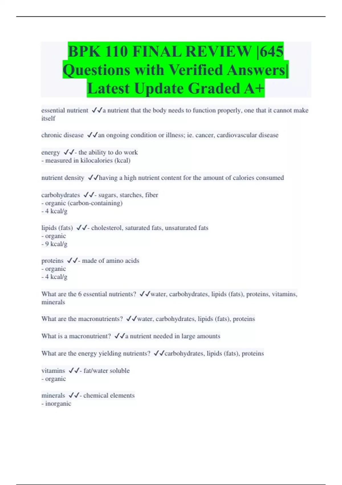BPK 110 FINAL REVIEW |645 Questions with Verified Answers| Latest Update Graded A+ essential nutrient a nutrient that the body needs to function properly, one that it cannot make itself chronic disease an ongoing condition or illness; ie. cancer, cardiovascular disease energy - the ability to do work - measured in kilocalories (kcal) nutrient density having a high nutrient content for the amount of calories consumed carbohydrates - sugars, starches, fiber - organic (carbon-containing) - 4 kcal/g lipids (fats) - cholesterol, saturated fats, unsaturated fats - organic - 9 kcal/g proteins - made of amino acids - organic - 4 kcal/g What are the 6 essential nutrients? water, carbohydrates, lipids (fats), proteins, vitamins, minerals What are the macronutrients? water, carbohydrates, lipids (fats), proteins What is a macronutrient? a nutrient needed in large amounts What are the energy yielding nutrients? carbohydrates, lipids (fats), proteins vitamins - fat/water soluble