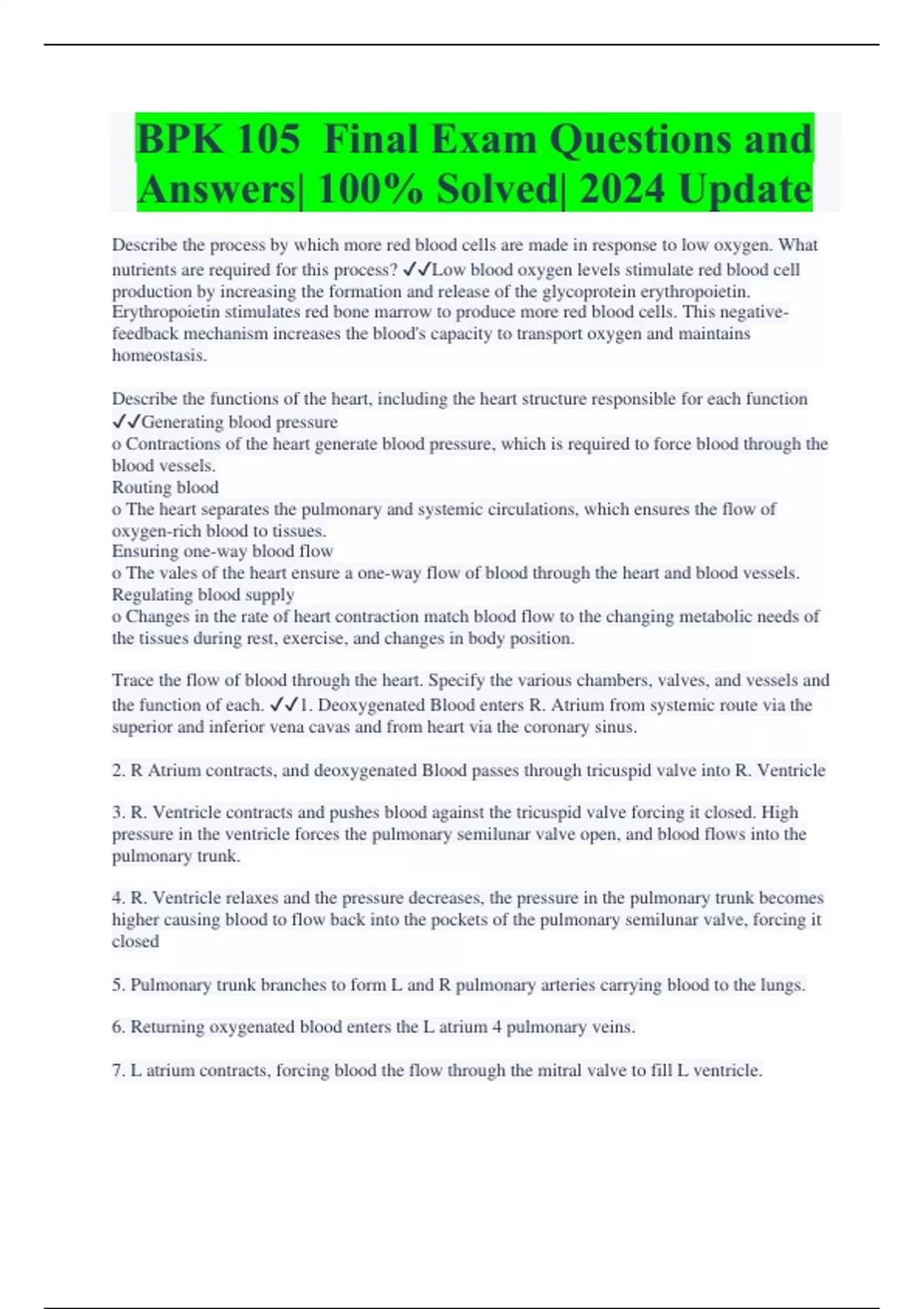 BPK 105 Final Exam Questions and Answers| 100% Solved| 2024 Update Describe the process by which more red blood cells are made in response to low oxygen. What nutrients are required for this process? Low blood oxygen levels stimulate red blood cell production by increasing the formation and release of the glycoprotein erythropoietin. Erythropoietin stimulates red bone marrow to produce more red blood cells. This negativefeedback mechanism increases the blood's capacity to transport oxygen and maintains homeostasis. Describe the functions of the heart, including the heart structure responsible for each function Generating blood pressure o Contractions of the heart generate blood pressure, which is required to force blood through the blood vessels. Routing blood o The heart separates the pulmonary and systemic circulations, which ensures the flow of oxygen-rich blood to tissues. Ensuring one-way blood flow o The vales of the heart ensure a one-way flow of blood through the heart and blood vessels. Regulating blood supply o Changes in the rate of heart contraction match blood flow to the changing metabolic needs of the tissues during rest, exercise, and changes in body position.