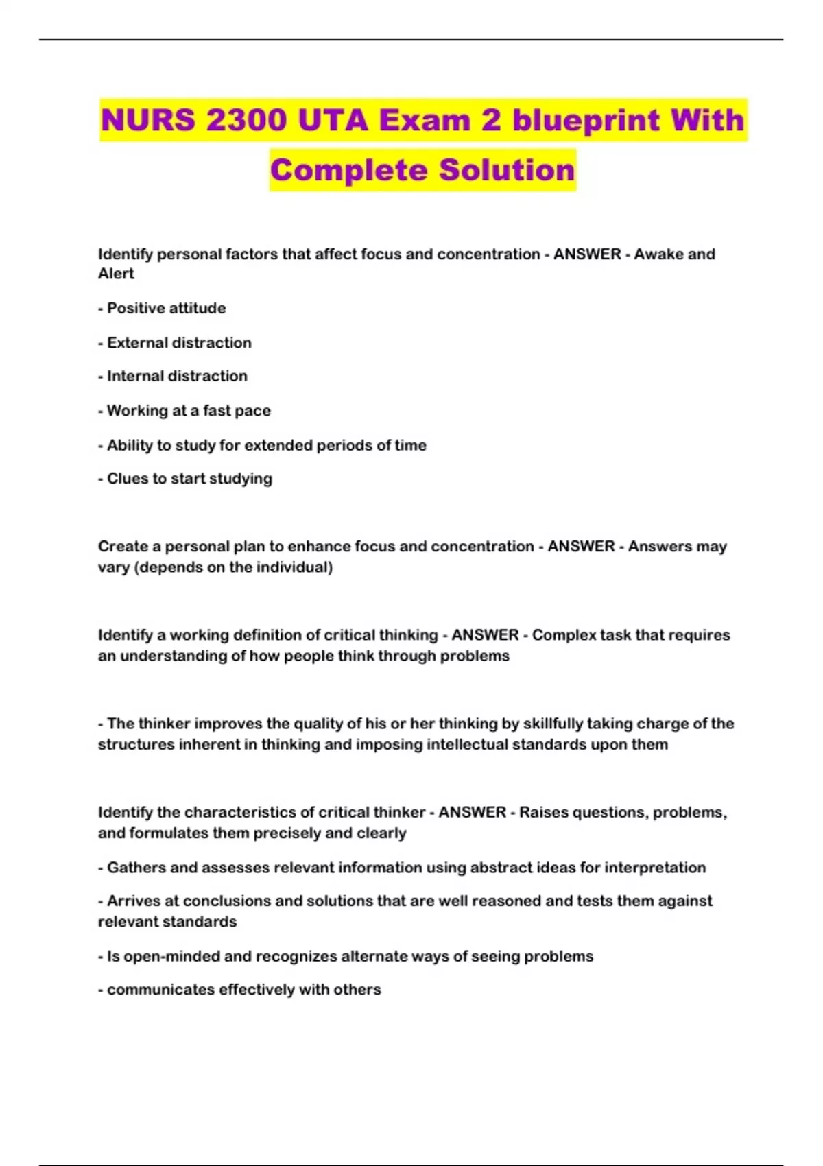 dentify personal factors that affect focus and concentration - ANSWER - Awake and Alert - Positive attitude - External distraction - Internal distraction - Working at a fast pace - Ability to study for extended periods of time - Clues to start studying Create a personal plan to enhance focus and concentration - ANSWER - Answers may vary (depends on the individual) Identify a working definition of critical thinking - ANSWER - Complex task that requires an understanding of how people think through problems - The thinker improves the quality of his or her thinking by skillfully taking charge of the structures inherent in thinking and imposing intellectual standards upon them Identify the characteristics of critical thinker - ANSWER - Raises questions, problems, and formulates them precisely and clearly - Gathers and assesses relevant information using abstract ideas for interpretation - Arrives at conclusions and solutions that are well reasoned and tests them against relevant standards - Is open-minded and recognizes alternate ways of seeing problems - communicates effectively with othersDiscuss how nurses use critical thinking and clinical judgment in practice - ANSWER - When interacting with patients (asking themselves questio